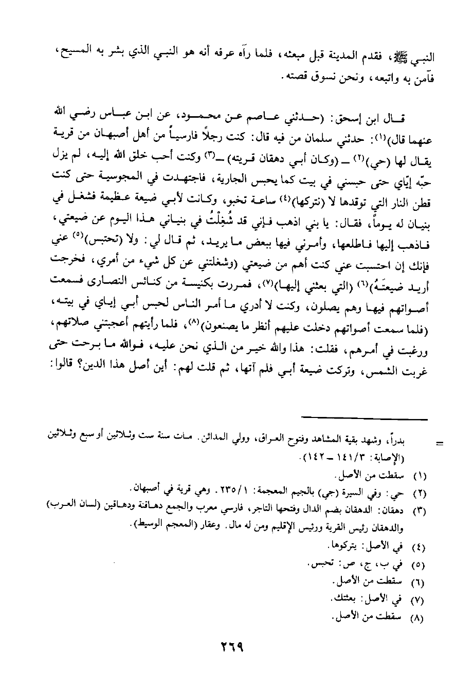 قَالَ ابْنُ إِسْحَاقَ: حَدَّثَنِي عَاصِمٌ، عَنْ مَحْمُودٍ، عَنِ ابْنِ عَبَّاسٍ رَضِيَ اللَّهُ عَنْهُمَا، قَالَ: حَدَّثَنِي سَلْمَانُ مِنْ فِيهِ، قَالَ: كُنْتُ رَجُلًا فَارِسِيًّا مِنْ أَهْلِ أَصْبَهَانَ مِنْ قَرْيَةٍ يُقَالُ لَهَا: (حَيٌّ) . وَكَانَ أَبِي دِهْقَانَ قَرْيَتِهِ، وَكُنْتُ أَحَبَّ خَلْقِ اللَّهِ إِلَيْهِ لَمْ يَزَلْ حُبُّهُ إِيَّايَ حَتَّى حَبَسَنِي فِي بَيْتٍ كَمَا يَحْبِسُ الْجَارِيَةَ، فَاجْتَهَدْتُ فِي الْمَجُوسِيَّةِ حَتَّى كُنْتُ قَطَنَ النَّارِ الَّتِي تُوقِدُهَا لَا نَتْرُكُهَا سَاعَةً تَخْبُو، وَكَانَتْ لِأَبِي ضَيْعَةٌ عَظِيمَةٌ فَشُغِلَ فِي بُنْيَانٍ لَهُ يَوْمًا. فَقَالَ: يَا بُنَيَّ، إِنِّي قَدْ شُغِلْتُ فِي بُنْيَانِي هَذَا الْيَوْمَ عَنْ ضَيْعَتِي فَاذْهَبْ إِلَيْهَا فَاطَّلِعْهَا، وَأَمَرَنِي فِيهَا بِبَعْضِ مَا يُرِيدُ، ثُمَّ قَالَ لِي: وَلَا تَحْتَبِسْ عَنِّي فَإِنَّكَ إِنِ احْتَبَسْتَ عَنِّي كُنْتَ أَهَمَّ إِلَيَّ مِنْ ضَيْعَتِي وَشَغَلْتَنِي عَنْ كُلِّ شَيْءٍ مِنْ أَمْرِي، فَخَرَجْتُ أُرِيدُ ضَيْعَتَهُ الَّتِي بَعَثَنِي إِلَيْهَا، فَمَرَرْتُ بِكَنِيسَةٍ مِنْ كَنَائِسِ النَّصَارَى فَسَمِعْتُ أَصْوَاتَهُمْ فِيهَا وَهُمْ يُصَلُّونَ، وَكُنْتُ لَا أَدْرِي مَا أَمْرُ النَّاسِ لِحَبْسِ أَبِي إِيَّايَ فِي بَيْتِهِ، فَلَمَّا سَمِعْتُ أَصْوَاتَهُمْ، دَخَلْتُ عَلَيْهِمْ أَنْظُرُ مَا يَصْنَعُونَ، فَلَمَّا رَأَيْتُهُمْ أَعْجَبَتْنِي صَلَاتُهُمْ، وَرَغِبْتُ فِي أَمْرِهِمْ، فَقُلْتُ: هَذَا وَاللَّهِ خَيْرٌ مِنَ الَّذِي نَحْنُ عَلَيْهِ، فَوَاللَّهِ مَا بَرِحْتُ حَتَّى غَرَبَتِ الشَّمْسُ وَتَرَكْتُ ضَيْعَةَ أَبِي فَلَمْ آتِهَا، ثُمَّ قُلْتُ لَهُمْ: أَيْنَ أَصْلُ هَذَا الدِّينَ؟ قَالُوا: