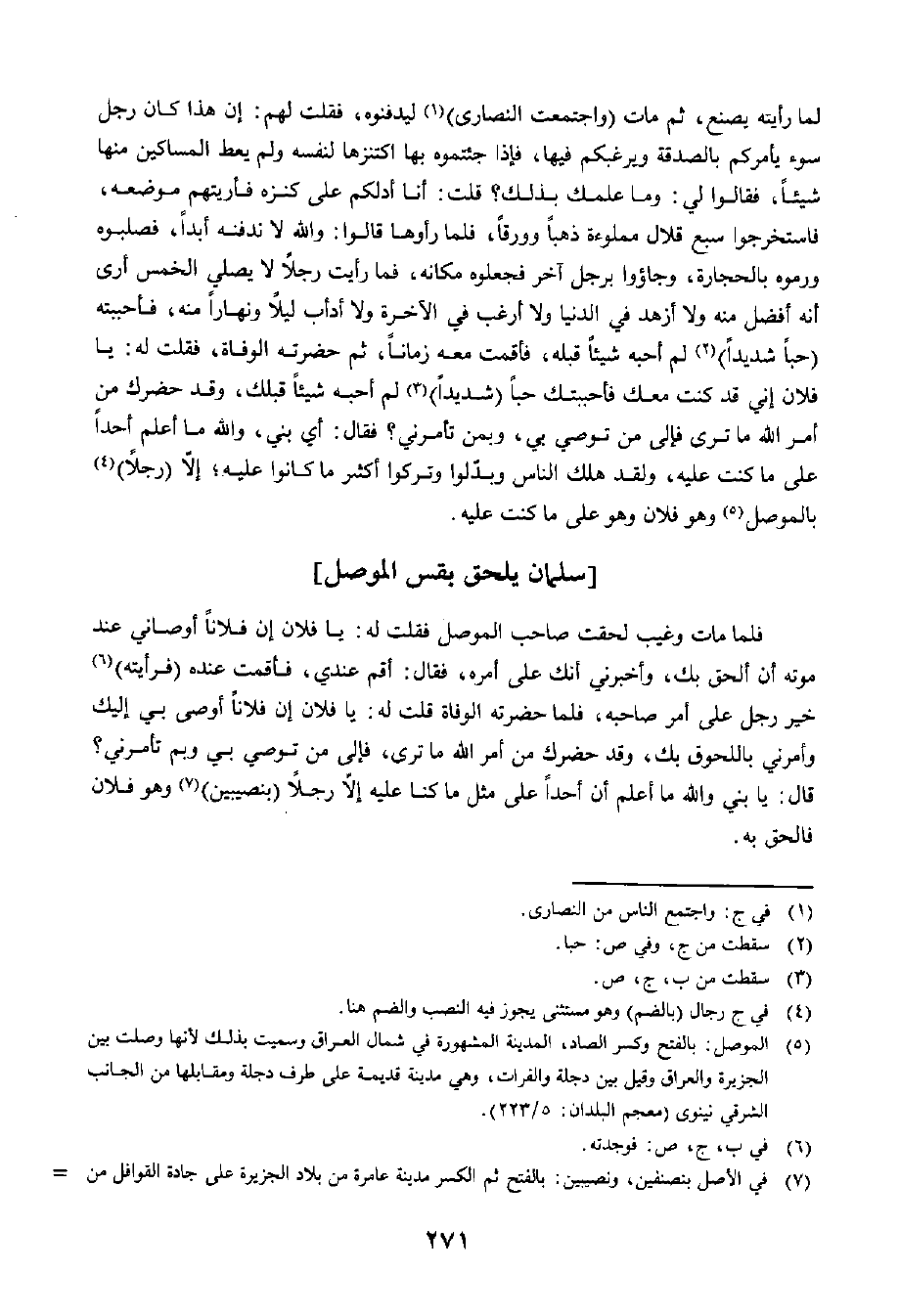 فَلَمَّا مَاتَ وَغُيِّبَ لَحِقَتْ بِصَاحِبِ الْمَوْصِلِ، فَقُلْتُ لَهُ: يَا فُلَانُ، إِنَّ فُلَانًا أَوْصَانِي عِنْدَ مَوْتِهِ أَنْ أَلْحَقَ بِكَ، وَأَخْبَرَنِي أَنَّكَ عَلَى أَمْرِهِ، فَقَالَ: أَقِمْ عِنْدِي، فَأَقَمْتُ عِنْدَهُ فَرَأَيْتُهُ خَيْرَ رَجُلٍ عَلَى أَمْرِ صَاحِبِهِ، فَلَمَّا حَضَرَتْهُ الْوَفَاةُ قُلْتُ لَهُ: يَا فُلَانُ، إِنَّ فُلَانًا أَوْصَى بِي إِلَيْكَ وَأَمَرَنِي بِاللُّحُوقِ بِكَ، وَقَدْ حَضَرَكَ مِنْ أَمْرِ اللَّهِ مَا تَرَى، فَإِلَى مَنْ تُوصِي بِي؟ وَبِمَ تَأْمُرُنِي؟ قَالَ: يَا بُنَيَّ، وَاللَّهِ مَا أَعْلَمُ رَجُلًا عَلَى مِثْلِ مَا كُنَّا عَلَيْهِ إِلَّا رَجُلًا بِنَصِيبِينَ وَهُوَ فُلَانٌ فَالْحَقْ بِهِ.
