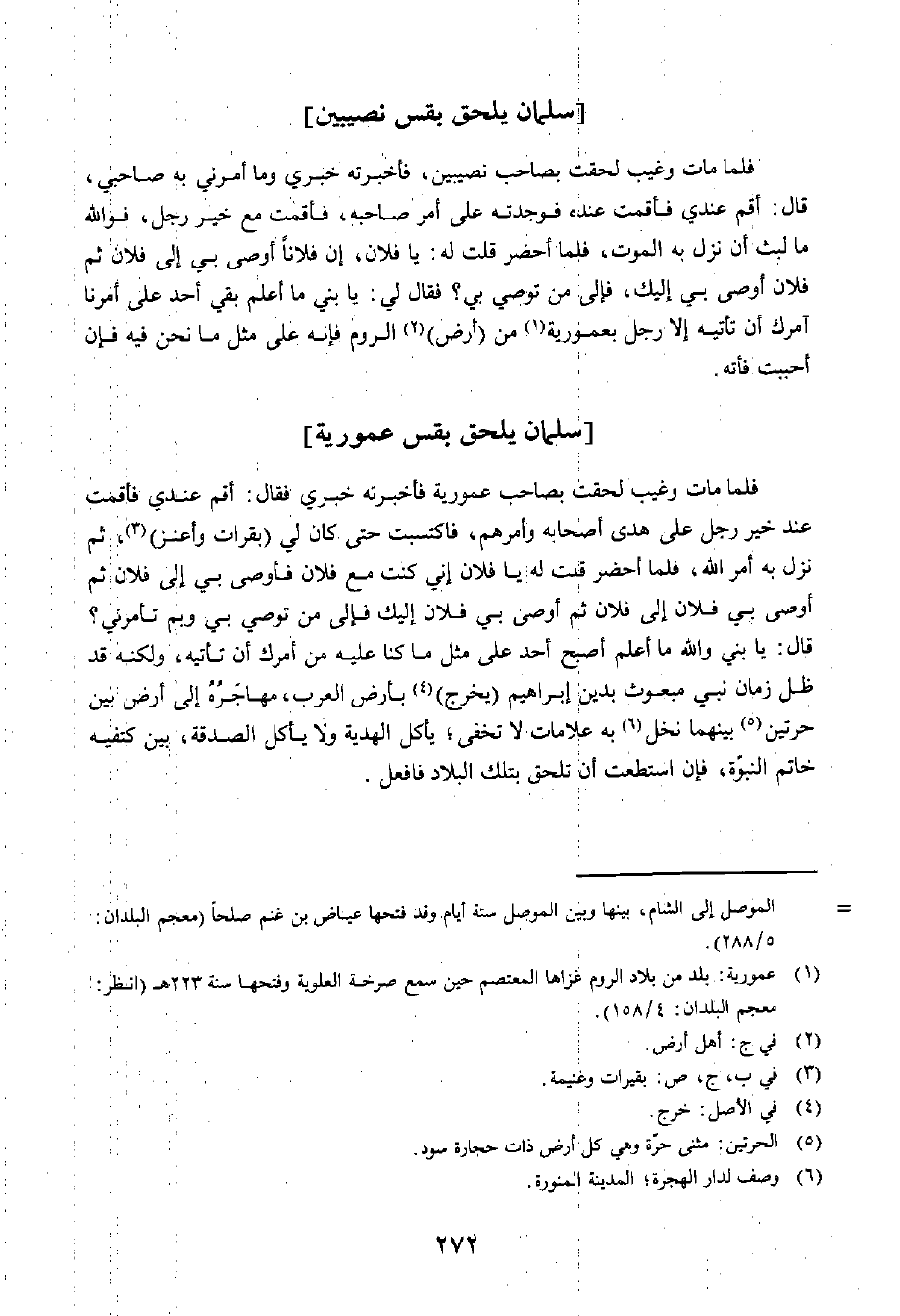 فَلَمَّا مَاتَ وَغُيِّبَ لَحِقْتُ بِصَاحِبِ عَمُورِيَّةَ فَأَخْبَرْتُهُ خَبَرِي، فَقَالَ: أَقِمْ عِنْدِي، فَأَقَمْتُ عِنْدَ خَيْرِ رَجُلٍ عَلَى هُدَى أَصْحَابِهِ وَأَمْرِهِمْ، فَاكْتَسَبْتُ حَتَّى كَانَتْ لِي بَقَرَاتٌ وَأَعْنُزٌ، ثُمَّ نَزَلَ بِهِ أَمْرُ اللَّهِ، فَلَمَّا أُحْضِرَ قُلْتُ لَهُ: يَا فُلَانُ، إِنِّي كُنْتُ مَعَ فُلَانٍ فَأَوْصَى بِي إِلَى فُلَانٍ، ثُمَّ أَوْصَى بِي فُلَانٌ إِلَى فُلَانٍ، ثُمَّ أَوْصَى بِي فُلَانٌ إِلَيْكَ، فَإِلَى مَنْ تُوصِي بِي؟ وَبِمَ تَأْمُرُنِي؟ قَالَ: يَا بُنَيَّ، وَاللَّهِ مَا أَعْلَمُهُ أَصْبَحَ أَحَدٌ عَلَى مِثْلِ مَا كُنَّا عَلَيْهِ مَنْ آمُرُكَ أَنْ تَأْتِيَهُ. وَلَكِنَّهُ قَدْ أَظَلَّ زَمَانُ نَبِيٍّ مَبْعُوثٍ بِدِينِ إِبْرَاهِيمِ يَخْرُجُ بِأَرْضِ الْعَرَبِ، مُهَاجَرُهُ إِلَى أَرْضٍ بَيْنَ حَرَّتَيْنِ، بَيْنَهُمَا نَخْلٌ، بِهِ عَلَامَاتٌ لَا تَخْفَى: يَأْكُلُ الْهَدِيَّةَ وَلَا يَأْكُلُ الصَّدَقَةَ، بَيْنَ كَتِفَيْهِ خَاتَمُ النُّبُوَّةِ، فَإِنِ اسْتَطَعْتَ أَنْ تَلْحَقَ بِتِلْكَ الْبِلَادِ فَافْعَلْ.