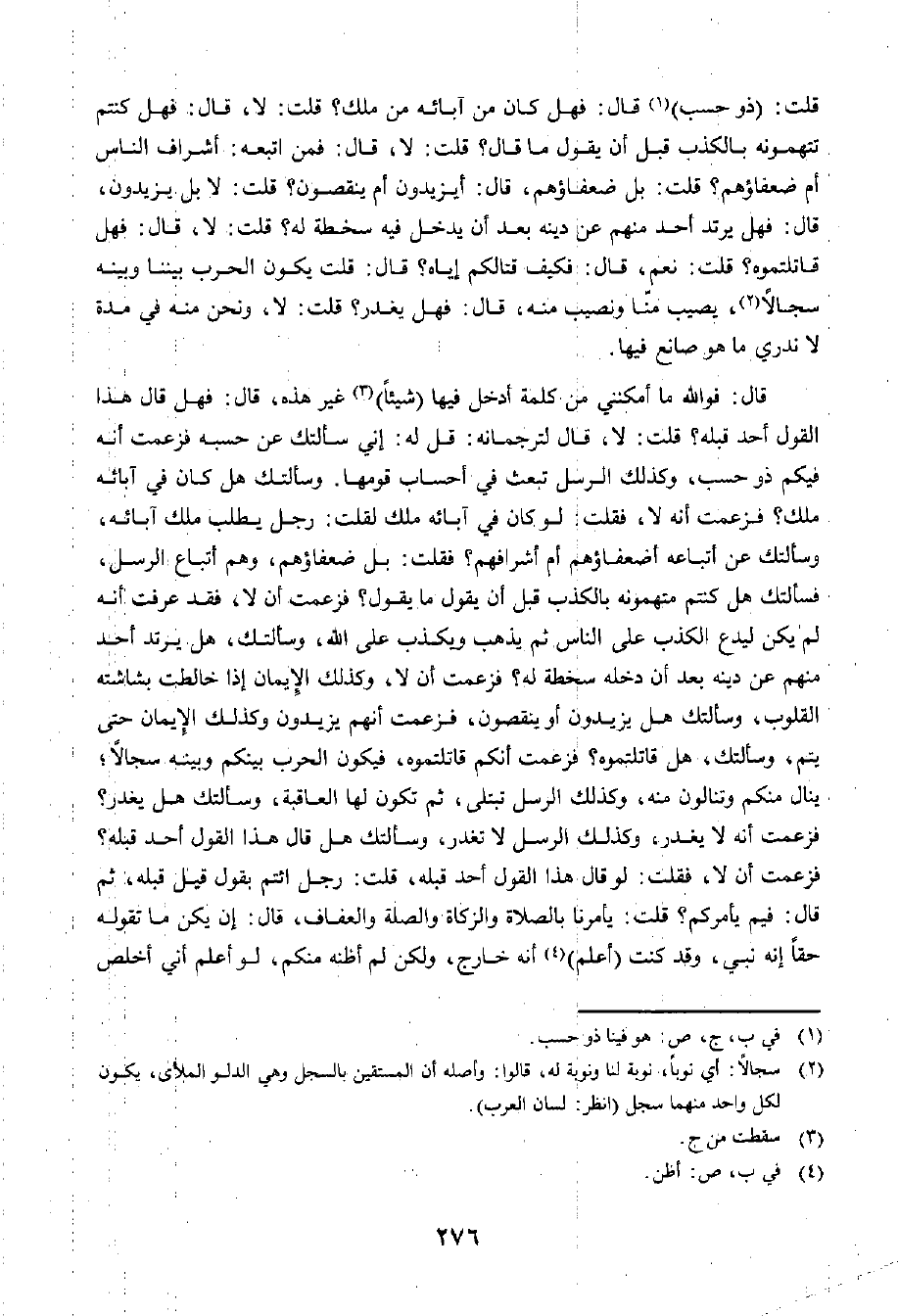 قُلْتُ: ذُو حَسَبٍ، قَالَ: فَهَلْ كَانَ مِنْ آبَائِهِ مِنْ مَلِكٍ؟ قُلْتُ: لَا. قَالَ: فَهَلْ كُنْتُمْ تَتَّهِمُونَهُ بِالْكَذِبِ قَبْلَ أَنْ يَقُولَ مَا قَالَ؟ قُلْتُ: لَا، قَالَ: فَمَنِ اتَّبَعَهُ، أَشْرَافُ النَّاسِ أَمْ ضُعَفَاؤُهُمْ؟ قُلْتُ: بَلْ ضُعَفَاؤُهُمْ، قَالَ: أَيَزِيدُونَ أَمْ يَنْقُصُونَ؟ قُلْتُ: لَا بَلْ يَزِيدُونَ، قَالَ: فَهَلْ يَرْتَدُّ أَحَدٌ مِنْهُمْ عَنْ دِينِهِ بَعْدَ أَنْ يَدْخُلَ فِيهِ سَخْطَةً لَهُ؟ قُلْتُ: لَا، قَالَ: فَهَلْ قَاتَلْتُمُوهُ؟ قُلْتُ: نَعَمْ، قَالَ: فَكَيْفَ قِتَالُكُمْ إِيَّاهُ؟ قَالَ: قُلْتُ يَكُونُ الْحَرْبُ بَيْنَنَا وَبَيْنَهُ سِجَالًا، يُصِيبُ مِنَّا، وَنُصِيبُ مِنْهُ، قَالَ: فَهَلْ يَغْدِرُ؟ قُلْتُ: لَا، وَنَحْنُ مِنْهُ فِي مُدَّةٍ لَا نَدْرِي مَا هُوَ صَانِعٌ فِيهَا.