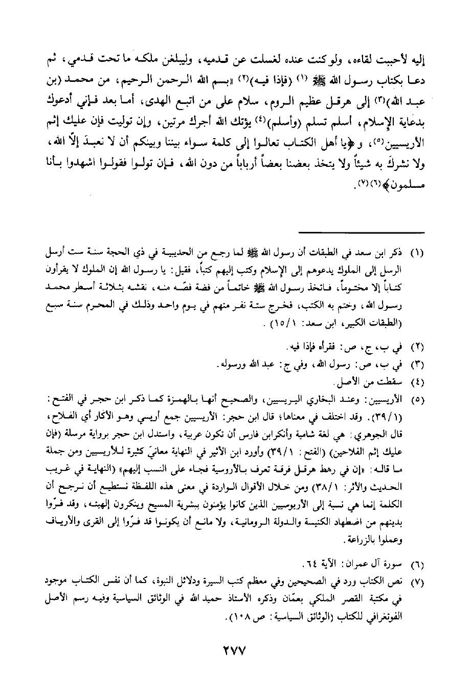 إِلَيْهِ لَأَحْبَبْتُ لِقَاءَهُ، وَلَوْ كُنْتُ عِنْدَهُ لَغَسَلْتُ عَنْ قَدَمَيْهِ، وَلَيَبْلُغَنَّ مُلْكُهُ مَا تَحْتَ قَدَمَيَّ، ثُمَّ دَعَا بِكِتَابِ رَسُولِ اللَّهِ صَلَّى اللَّهُ عَلَيْهِ وَسَلَّمَ فَإِذَا فِيهِ: بِسْمِ اللَّهِ الرَّحْمَنِ الرَّحِيمِ، مِنْ مُحَمَّدِ بْنِ عَبْدِ اللَّهِ إِلَى هِرَقْلَ عَظِيمِ الرُّومِ، سَلَامٌ عَلَى مَنِ اتَّبَعَ الْهُدَى، أَمَّا بَعْدُ فَإِنِّي أَدْعُوكَ بِدِعَايَةِ الْإِسْلَامِ، أَسْلِمْ تَسْلَمْ، أَسْلِمْ يُؤْتِكَ اللَّهُ أَجْرَكَ مَرَّتَيْنِ، وَإِنْ تَوَلَّيْتَ فَإِنَّ عَلَيْكَ إِثْمَ الْأَرِيسِيِّينَ وَقُلْ يَاأَهْلَ الْكِتَابِ تَعَالَوْا إِلَى كَلِمَةٍ سَوَاءٍ بَيْنَنَا وَبَيْنَكُمْ أَلَّا نَعْبُدَ إِلَّا اللَّهَ وَلَا نُشْرِكَ بِهِ شَيْئًا وَلَا يَتَّخِذَ بَعْضُنَا بَعْضًا أَرْبَابًا مِنْ دُونِ اللَّهِ فَإِنْ تَوَلَّوْا فَقُولُوا اشْهَدُوا بِأَنَّا مُسْلِمُونَ.