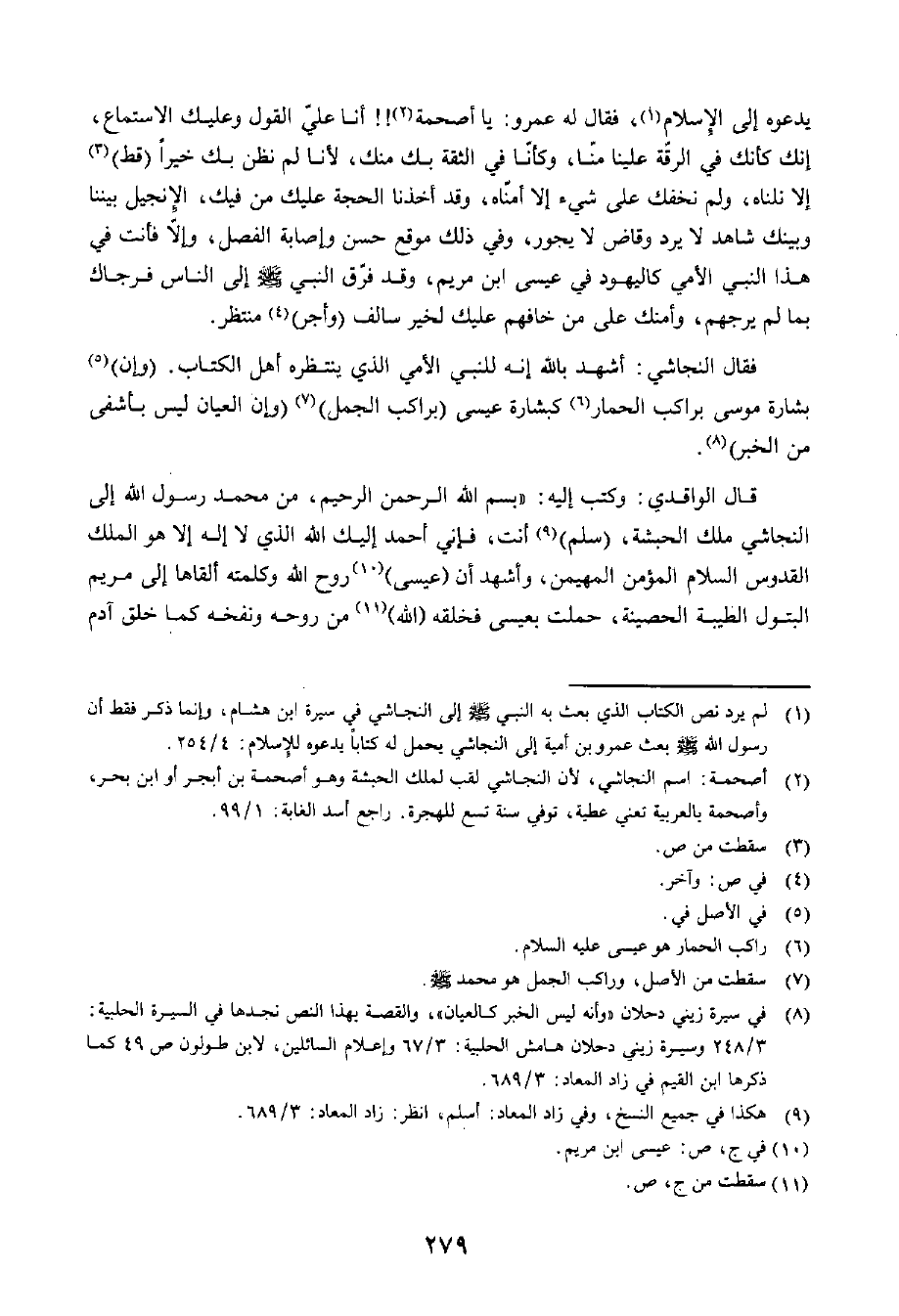 فَقَالَ النَّجَاشِيُّ: أَشْهَدُ بِاللَّهِ إِنَّهُ لَلنَّبِيُّ الْأُمِّيُّ الَّذِي يَنْتَظِرُهُ أَهْلُ الْكِتَابِ، وَإِنَّ بِشَارَةَ مُوسَى بِرَاكِبِ الْحِمَارِ كَبِشَارَةِ عِيسَى بِرَاكِبِ الْجَمَلِ، (وَإِنَّ الْعَيَانَ لَيْسَ بِأَشْفَى مِنَ الْخَبَرِ) قَالَ الْوَاقِدِيُّ: وَكَتَبَ إِلَيْهِ " بِسْمِ اللَّهِ الرَّحْمَنِ الرَّحِيمِ، مِنْ مُحَمَّدٍ رَسُولِ اللَّهِ إِلَى النَّجَاشِيِّ مَلِكِ الْحَبَشَةَ (سَلَمٌ) أَنْتَ، فَإِنِّي أَحْمَدُ إِلَيْكَ اللَّهَ الَّذِي لَا إِلَهَ إِلَّا هُوَ الْمَلِكُ الْقُدُّوسُ السَّلَامُ الْمُؤْمِنُ الْمُهَيْمِنُ، وَأَشْهَدُ أَنَّ عِيسَى رُوحُ اللَّهِ وَكَلِمَتُهُ أَلْقَاهَا إِلَى مَرْيَمَ الْبَتَوُلِ الطَّيِّبَةِ الْحَصِينَةِ، حَمَلَتْ بِعِيسَى فَخَلَقَهُ اللَّهُ مِنْ رُوحِهِ وَنَفَخَهُ كَمَا خَلَقَ آدَمَ