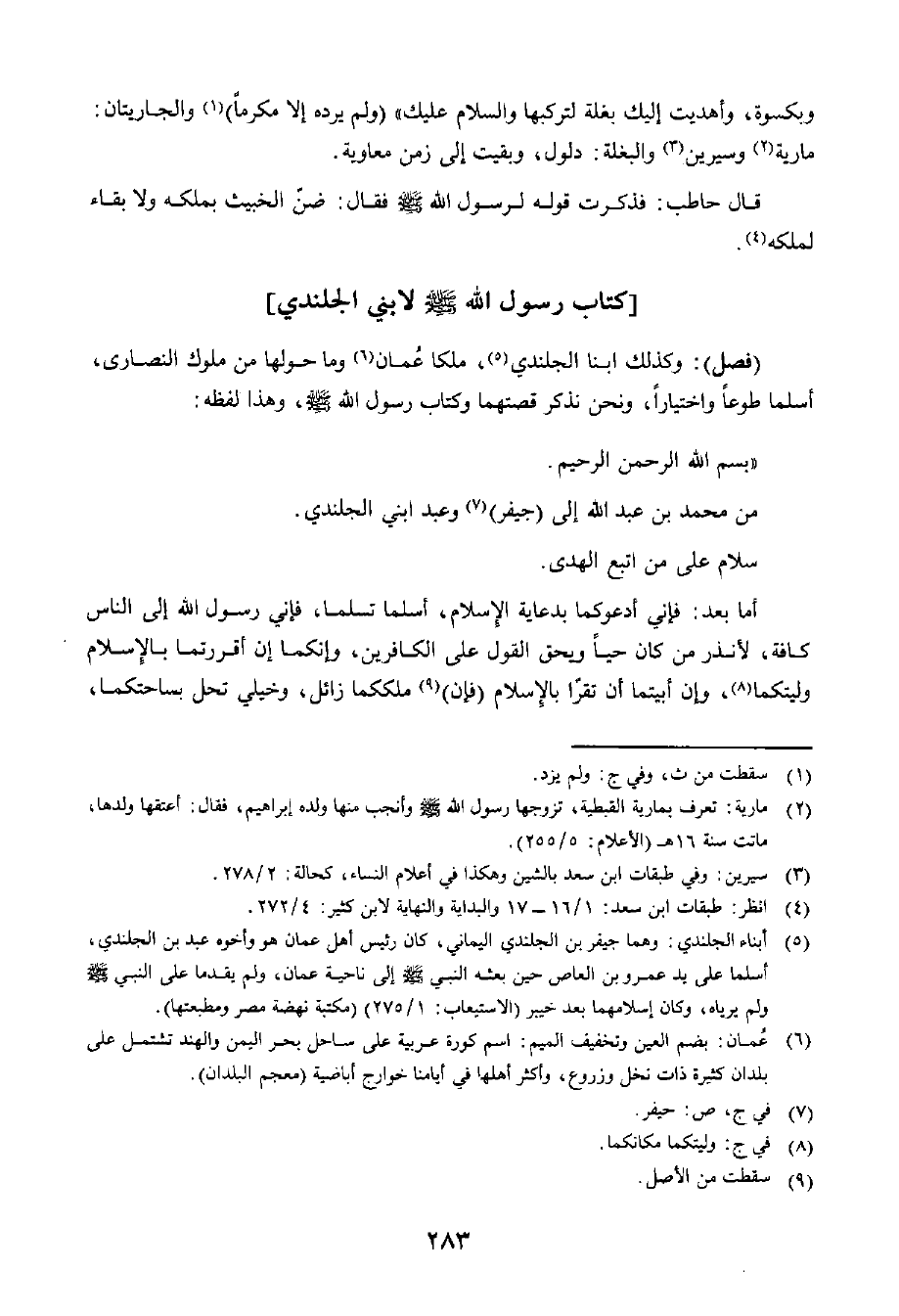 (فَصْلٌ) : وَكَذَلِكَ ابْنَا الْجَلَنْدِيِّ، مَلِكَا عُمَانَ وَمَا حَوْلَهَا مِنْ مُلُوكِ النَّصَارَى، أَسْلَمَا طَوْعًا وَاخْتِيَارًا، وَنَحْنُ نَذْكُرُ قِصَّتَهُمَا وَكِتَابَ رَسُولِ اللَّهِ صَلَّى اللَّهُ عَلَيْهِ وَسَلَّمَ إِلَيْهِمَا، وَهَذَا لَفْظُهُ: