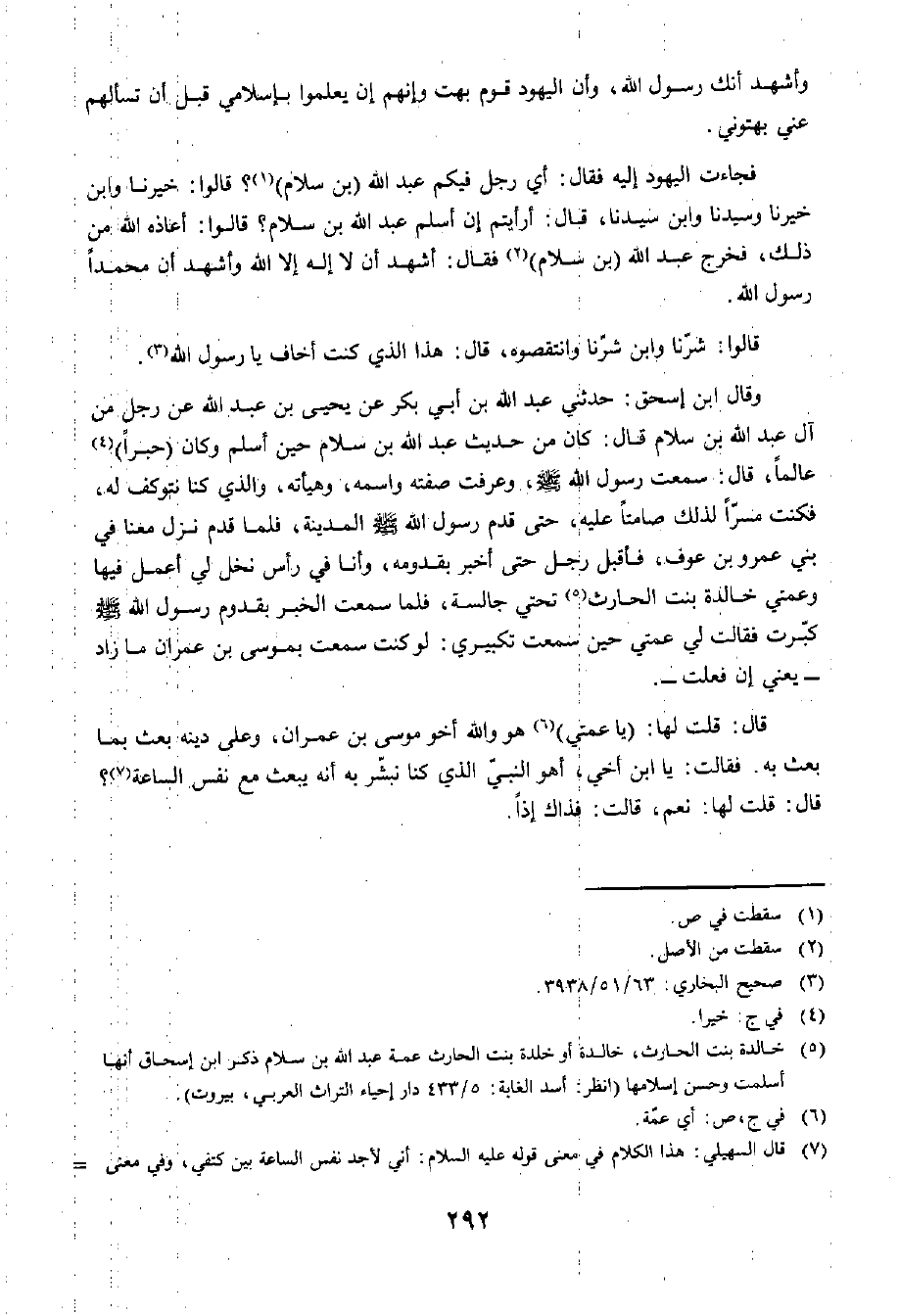 وَقَالَ ابْنُ إِسْحَاقَ: حَدَّثَنِي عَبْدُ اللَّهِ بْنُ أَبِي بَكْرٍ، عَنْ يَحْيَى بْنِ عَبْدِ اللَّهِ، عَنْ رَجُلٍ مِنْ آلِ عَبْدِ اللَّهِ بْنِ سَلَامٍ، قَالَ: كَانَ مِنْ حَدِيثِ عَبْدِ اللَّهِ بْنِ سَلَامٍ حِينَ أَسْلَمَ، وَكَانَ حَبْرًا عَالِمًا، قَالَ: سَمِعْتُ رَسُولَ اللَّهِ صَلَّى اللَّهُ عَلَيْهِ وَسَلَّمَ، وَعَرَفْتُ صِفَتَهُ وَاسْمَهُ، وَهَيْأَتَهُ، وَالَّذِي كُنَّا نَتَوَكَّفُ لَهُ، فَكُنْتُ مُسِرًّا لِذَلِكَ صَامِتًا عَلَيْهِ، حَتَّى قَدِمَ رَسُولُ اللَّهِ صَلَّى اللَّهُ عَلَيْهِ وَسَلَّمَ الْمَدِينَةَ، فَلَمَّا قَدِمَ نَزَلَ مَعَنَا فِي بَنِي عَمْرِو بْنِ عَوْفٍ، فَأَقْبَلَ رَجُلٌ حَتَّى أَخْبَرَ بِقُدُومِهِ، وَأَنَا فِي رَأْسِ نَخْلٍ لِي أَعْمَلُ فِيهَا، وَعَمَّتِي خَالِدَةُ بِنْتُ الْحَارِثِ تَحْتِي جَالِسَةٌ، فَلَمَّا سَمِعْتُ الْخَبَرَ بِقُدُومِ رَسُولِ اللَّهِ صَلَّى اللَّهُ عَلَيْهِ وَسَلَّمَ، كَبَّرْتُ، فَقَالَتْ لِي عَمَّتِي حِينَ سَمِعَتْ تَكْبِيرِي: لَوْ كُنْتَ سَمِعْتَ بِمُوسَى بْنِ عِمْرَانَ مَا زَادَ. يَعْنِي إِنْ فَعَلْتَ.