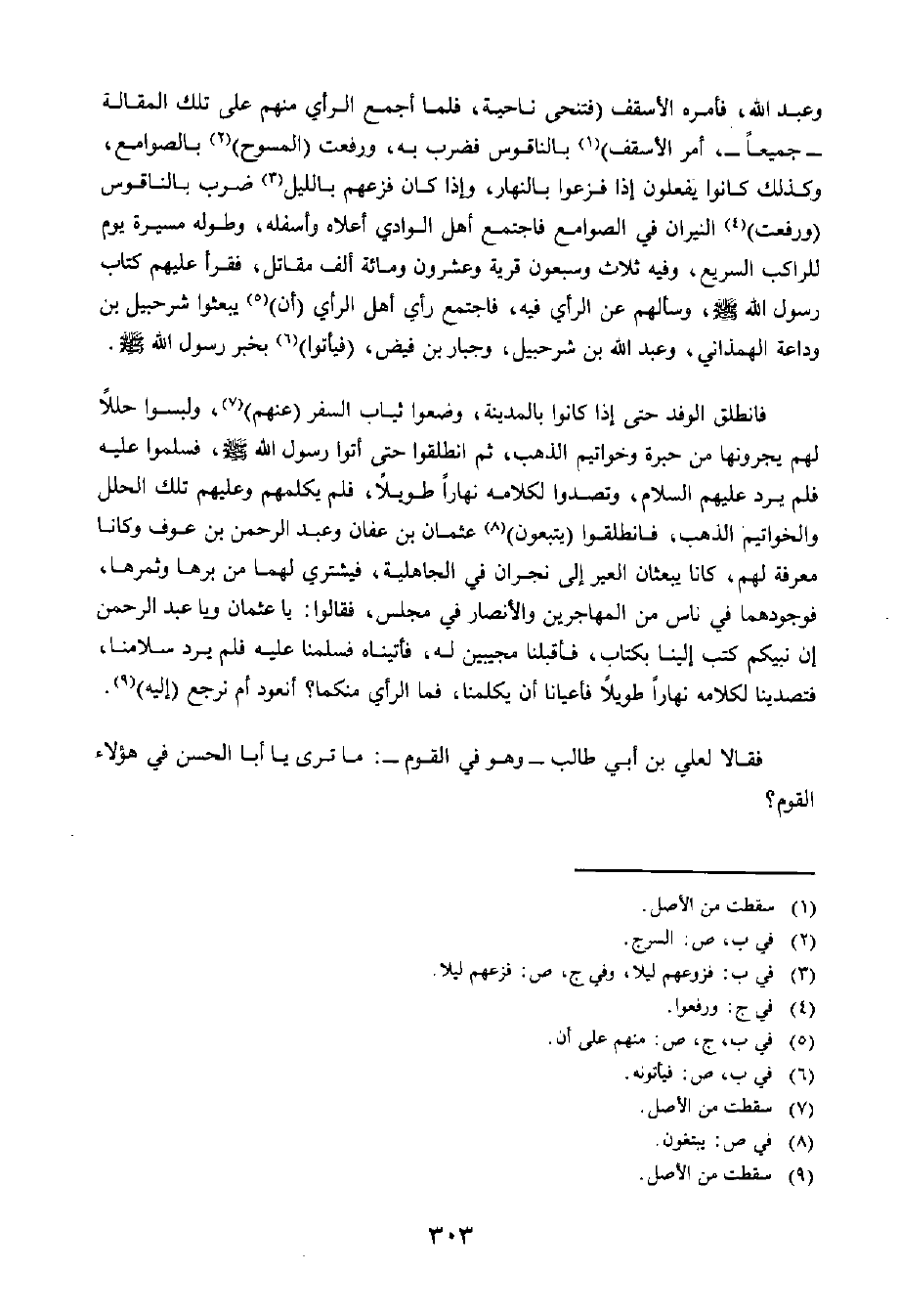 فَقَالَا لِعَلِيِّ بْنِ أَبِي طَالِبٍ - وَهُوَ فِي الْقَوْمِ -: مَا تَرَى يَا أَبَا الْحَسَنِ فِي هَؤُلَاءِ الْقَوْمِ؟
