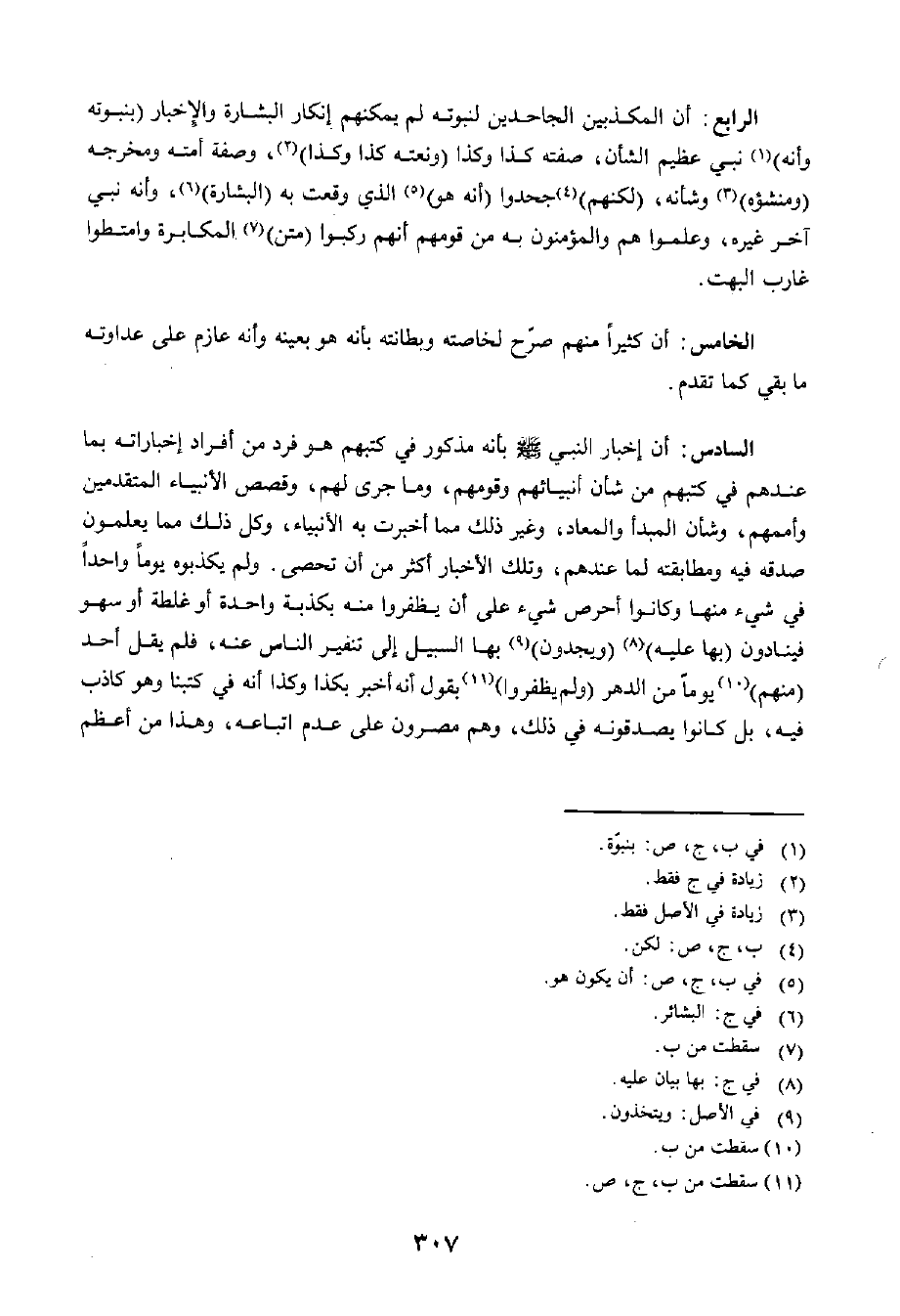 السَّادِسُ: أَنَّ إِخْبَارَ النَّبِيِّ صَلَّى اللَّهُ عَلَيْهِ وَسَلَّمَ بِأَنَّهُ مَذْكُورٌ فِي كُتُبِهِمْ هُوَ فَرْدٌ مِنْ أَفْرَادِ إِخْبَارَاتِهِ بِمَا عِنْدَهُمْ فِي كُتُبِهِمْ مِنْ شَأْنِ أَنْبِيَائِهِمْ وَقَوْمِهِمْ، وَمَا جَرَى لَهُمْ، وَقَصَصِ الْأَنْبِيَاءِ الْمُتَقَدِّمِينَ وَأُمَمِهِمْ، وَشَأْنِ الْمَبْدَأِ وَالْمَعَادِ، وَغَيْرِ ذَلِكَ مِمَّا أَخْبَرَتْ بِهِ الْأَنْبِيَاءُ، وَكُلُّ ذَلِكَ مِمَّا يَعْلَمُونَ صِدْقَهُ فِيهِ، وَمُطَابَقَتَهُ لِمَا عِنْدَهُمْ، وَتِلْكَ الْأَخْبَارُ أَكْثَرُ مِنْ أَنْ تُحْصَى، وَلَمْ يُكَذِّبُوهُ يَوْمًا وَاحِدًا فِي شَيْءٍ مِنْهَا، وَكَانُوا أَحْرَصَ شَيْءٍ عَلَى أَنْ يَظْفَرُوا مِنْهُ بِكَذِبَةٍ وَاحِدَةٍ أَوْ غَلْطَةٍ أَوْ سَهْوٍ فَيُنَادُونَ بِهَا عَلَيْهِ، وَيَجِدُونَ بِهَا السَّبِيلَ إِلَى تَنْفِيرِ النَّاسِ عَنْهُ، فَلَمْ يَقُلْ أَحَدٌ مِنْهُمْ يَوْمًا مِنَ الدَّهْرِ، وَلَمْ يَظْفَرُوا بِقَوْلٍ أَنَّهُ أَخْبَرَ بِكَذَا وَكَذَا فِي كُتُبِنَا وَهُوَ كَاذِبٌ فِيهِ، بَلْ كَانُوا يُصَدِّقُونَهُ فِي ذَلِكَ، وَهُمْ مُصِرُّونَ عَلَى عَدَمِ اتِّبَاعِهِ، وَهَذَا مِنْ أَعْظَمِ