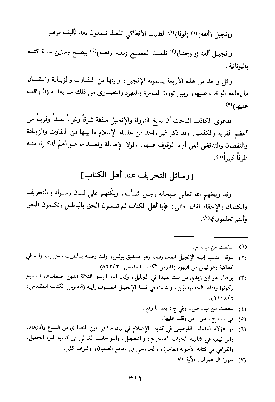 وَكُلُّ وَاحِدٍ مِنْ هَذِهِ الْأَرْبَعَةِ يُسَمُّونَهُ الْإِنْجِيلَ، وَبَيْنَهَا مِنَ التَّفَاوُتِ وَالزِّيَادَةِ وَالنُّقْصَانِ مَا يَعْلَمُهُ الْوَاقِفُ عَلَيْهَا، وَبَيْنَ تَوْرَاةِ السَّامِرَةِ وَالْيَهُودِ وَالنَّصَارَى مِنْ ذَلِكَ مَا يَعْلَمُهُ الْوَاقِفُ عَلَيْهَا.