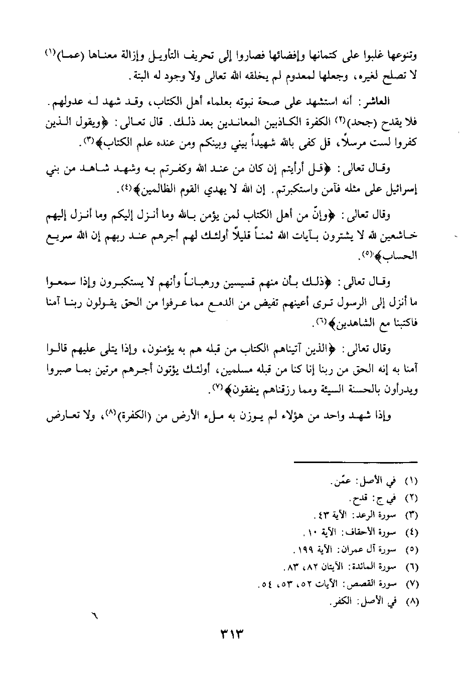 الْعَاشِرُ: أَنَّهُ اسْتَشْهَدَ عَلَى صِحَّةِ نُبُوَّتِهِ بِعُلَمَاءِ أَهْلِ الْكِتَابِ، وَقَدْ شَهِدَ لَهُ عُدُولُهُمْ فَلَا يَقْدَحُ جَحْدُ الْكَفَرَةِ الْكَاذِبِينَ الْمُعَانِدِينَ بَعْدَ ذَلِكَ، قَالَ تَعَالَى: وَيَقُولُ الَّذِينَ كَفَرُوا لَسْتَ مُرْسَلًا قُلْ كَفَى بِاللَّهِ شَهِيدًا بَيْنِي وَبَيْنَكُمْ وَمَنْ عِنْدَهُ عِلْمُ الْكِتَابِ.