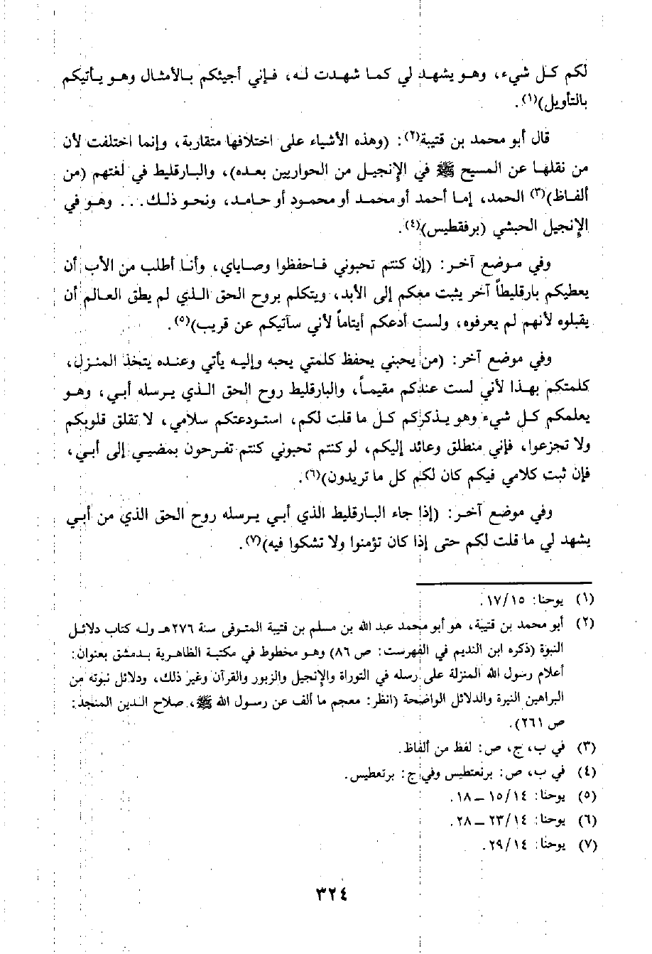 قَالَ أَبُو مُحَمَّدِ بْنُ قُتَيْبَةَ: وَهَذِهِ الْأَشْيَاءُ عَلَى اخْتِلَافِهَا مُتَقَارِبَةٌ، وَإِنَّمَا اخْتَلَفَتْ لِأَنَّ مَنْ نَقَلَهَا عَنِ الْمَسِيحِ صَلَّى اللَّهُ عَلَيْهِ وَسَلَّمَ فِي الْإِنْجِيلِ مِنَ الْحَوَارِيِّينَ بَعْدَهُ، وَالْبَارَقْلِيطُ فِي لُغَتِهِمْ مِنْ أَلْفَاظِ الْحَمْدِ، إِمَّا أَحْمَدُ أَوْ مُحَمَّدٌ أَوْ مَحْمُودٌ أَوْ حَامِدٌ وَنَحْوُ ذَلِكَ ... وَهُوَ فِي الْإِنْجِيلِ الْحَبَشِيِّ: بَرَفْقِطِيسُ.