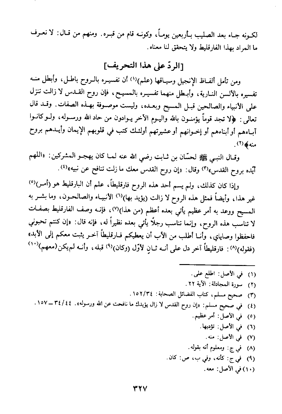 وَمَنْ تَأَمَّلَ أَلْفَاظَ الْإِنْجِيلِ وَسِيَاقَهَا عَلِمَ أَنَّ تَفْسِيرَهُ بِالرُّوحِ بَاطِلٌ، وَأَبْطَلُ مِنْهُ تَفْسِيرُهُ بِالْأَلْسُنِ النَّارِيَّةِ، وَأَبْطَلُ مِنْهُمَا تَفْسِيرُهُ بِالْمَسِيحِ، فَإِنَّ رُوحَ الْقُدُسِ لَا زَالَتْ تَنْزِلُ عَلَى الْأَنْبِيَاءِ وَالصَّالِحِينَ قَبْلَ الْمَسِيحِ وَبَعْدَهُ، وَلَيْسَتْ مَوْصُوفَةً بِهَذِهِ الصِّفَاتِ، وَقَدْ قَالَ تَعَالَى: لَا تَجِدُ قَوْمًا يُؤْمِنُونَ بِاللَّهِ وَالْيَوْمِ الْآخِرِ يُوَادُّونَ مَنْ حَادَّ اللَّهَ وَرَسُولَهُ وَلَوْ كَانُوا آبَاءَهُمْ أَوْ أَبْنَاءَهُمْ أَوْ إِخْوَانَهُمْ أَوْ عَشِيرَتَهُمْ أُولَئِكَ كَتَبَ فِي قُلُوبِهِمُ الْإِيمَانَ وَأَيَّدَهُمْ بِرُوحٍ مِنْهُ.