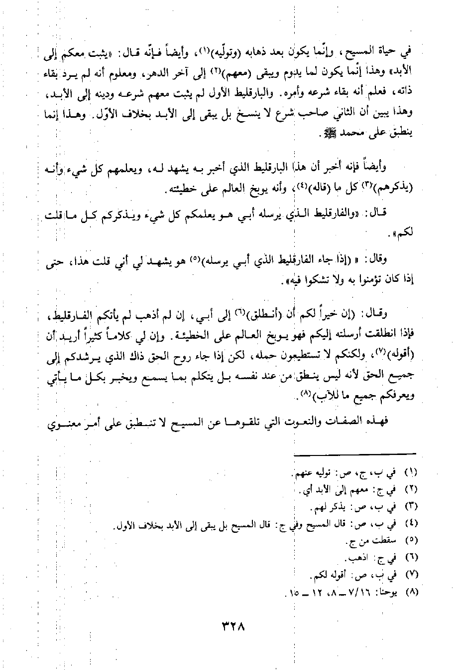 فِي حَيَاةِ الْمَسِيحِ، وَإِنَّمَا يَكُونُ بَعْدَ ذَهَابِهِ وَتَوَلِّيهِ، وَأَيْضًا فَإِنَّهُ قَالَ: يَثْبُتُ مَعَكُمْ إِلَى الْأَبَدِ وَهَذَا إِنَّمَا يَكُونُ لِمَا يَدُومُ وَيَبْقَى مَعَهُمْ إِلَى آخِرِ الدَّهْرِ، وَمَعْلُومٌ أَنَّهُ لَمْ يُرِدْ بَقَاءَ ذَاتِهِ، فَعُلِمَ أَنَّهُ بَقَاءُ شَرْعِهِ وَأَمْرِهِ، وَالْبَارَقْلِيطُ الْأَوَّلُ لَمْ يَثْبُتْ مَعَهُمْ شَرْعُهُ وَدِينُهُ إِلَى الْأَبَدِ، وَهَذَا يُبَيِّنُ أَنَّ الثَّانِي صَاحِبُ شَرْعٍ لَا يُنْسَخُ بَلْ يَبْقَى إِلَى الْأَبَدِ بِخِلَافِ الْأَوَّلِ، وَهَذَا إِنَّمَا يَنْطَبِقُ عَلَى مُحَمَّدٍ صَلَّى اللَّهُ عَلَيْهِ وَسَلَّمَ.
