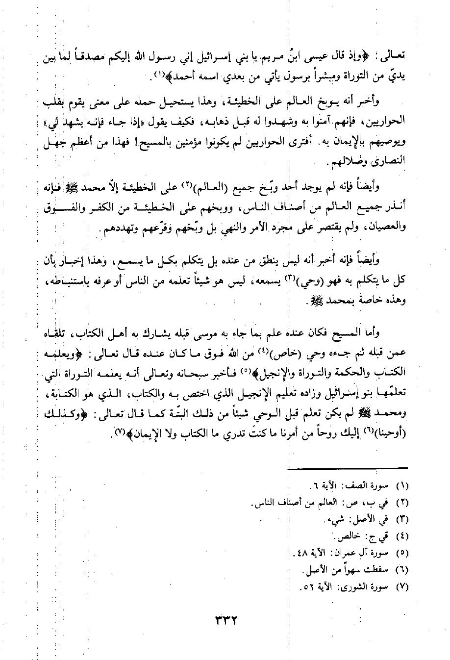وَأَمَّا الْمَسِيحُ فَكَانَ عِنْدَهُ عِلْمٌ بِمَا جَاءَ بِهِ مُوسَى قَبْلَهُ يُشَارِكُ بِهِ أَهْلَ الْكِتَابِ، تَلَقَّاهُ عَمَّنْ قَبْلَهُ، ثُمَّ جَاءَهُ وَحْيٌ خَاصٌّ مِنَ اللَّهِ فَوْقَ مَا كَانَ عِنْدَهُ، قَالَ تَعَالَى: وَيُعَلِّمُهُ الْكِتَابَ وَالْحِكْمَةَ وَالتَّوْرَاةَ وَالْإِنْجِيلَ فَأَخْبَرَ سُبْحَانَهُ وَتَعَالَى أَنَّهُ يُعَلِّمُهُ التَّوْرَاةَ الَّتِي تَعَلَّمَهَا بَنُو إِسْرَائِيلَ، وَزَادَهُ تَعْلِيمَ الْإِنْجِيلِ الَّذِي اخْتُصَّ بِهِ، وَالْكِتَابَ الَّذِي هُوَ الْكِتَابَةُ، وَمُحَمَّدٌ صَلَّى اللَّهُ عَلَيْهِ وَسَلَّمَ لَمْ يَكُنْ تَعَلَّمَ قَبْلَ الْوَحْيِ شَيْئًا أَلْبَتَّةَ، كَمَا قَالَ تَعَالَى: وَكَذَلِكَ أَوْحَيْنَا إِلَيْكَ رُوحًا مِنْ أَمْرِنَا مَا كُنْتَ تَدْرِي مَا الْكِتَابُ وَلَا الْإِيمَانُ.