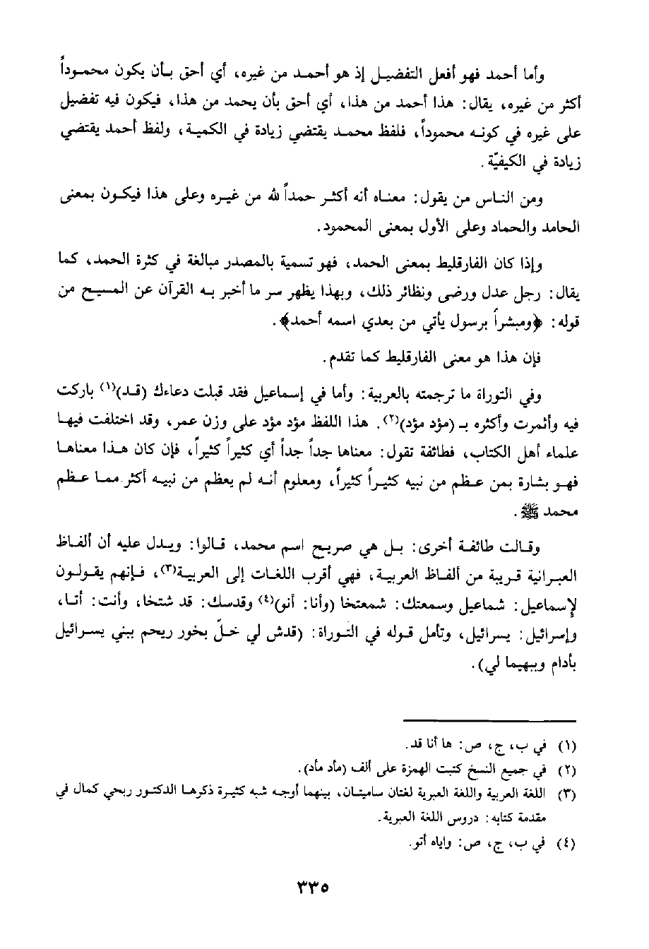 وَإِذَا كَانَ الْفَارَقْلِيطُ بِمَعْنَى الْحَمْدِ، فَهُوَ تَسْمِيَةٌ بِالْمَصْدَرِ مُبَالَغَةً فِي كَثْرَةِ الْحَمْدِ، كَمَا يُقَالُ: رَجُلٌ عَدْلٌ وَرِضًى وَنَظَائِرُ ذَلِكَ، وَبِهَذَا يَظْهَرُ سِرُّ مَا أَخْبَرَ بِهِ الْقُرْآنُ عَنِ الْمَسِيحِ مِنْ قَوْلِهِ: وَمُبَشِّرًا بِرَسُولٍ يَأْتِي مِنْ بَعْدِي اسْمُهُ أَحْمَدُ.