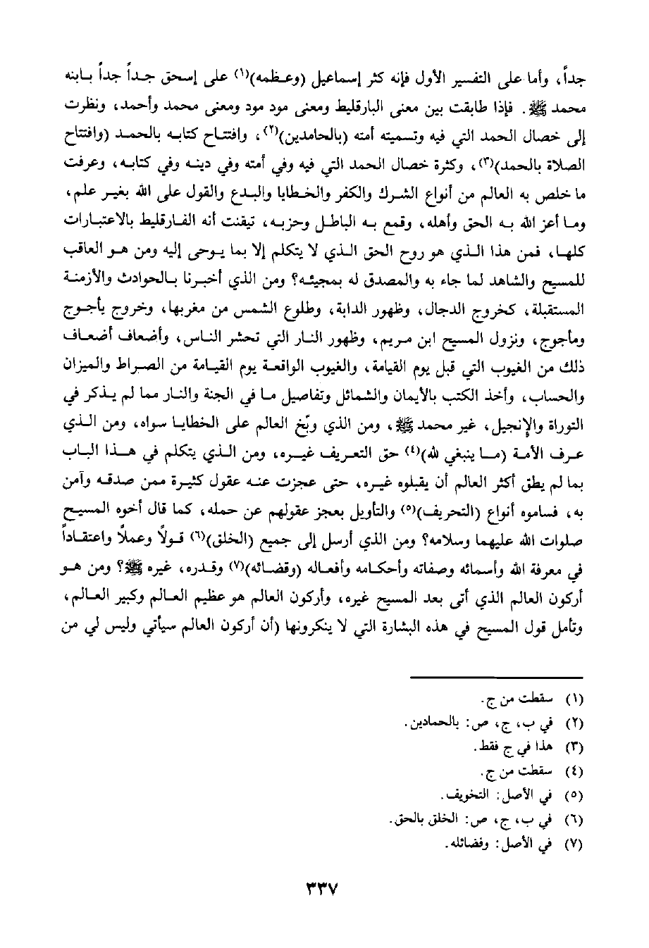 جِدًّا، وَأَمَّا عَلَى التَّفْسِيرِ الْأَوَّلِ فَإِنَّمَا كَثَّرَ إِسْمَاعِيلَ وَعَظَّمَهُ عَلَى إِسْحَاقَ جِدًّا جِدًّا بِابْنِهِ مُحَمَّدٍ صَلَّى اللَّهُ عَلَيْهِ وَسَلَّمَ. فَإِذَا طَابَقْتَ بَيْنَ مَعْنَى الْبَارَقْلِيطِ وَمَعْنَى مُوَدَ مُوَدَ وَمَعْنَى مُحَمَّدٍ وَأَحْمَدَ وَنَظَرْتَ إِلَى خِصَالِ الْحَمْدِ الَّتِي فِيهِ وَتَسْمِيَتِهِ أُمَّتَهُ بِالْحَامِدِينَ، وَافْتِتَاحِ كِتَابِهِ بِالْحَمْدِ، وَافْتِتَاحِ الصَّلَاةِ بِالْحَمْدِ، وَكَثْرَةِ خِصَالِ الْحَمْدِ الَّتِي فِيهِ، وَفِي أُمَّتِهِ وَفِي دِينِهِ، وَفِي كِتَابِهِ، وَعَرَفْتَ مَا خَلَّصَ بِهِ الْعَالِمَ مِنْ أَنْوَاعِ الشِّرْكِ وَالْكُفْرِ وَالْخَطَايَا وَالْبِدَعِ، وَالْقَوْلِ عَلَى اللَّهِ بِغَيْرِ عِلْمٍ، وَمَا أَعَزَّ اللَّهُ بِهِ الْحَقَّ وَأَهْلَهُ، وَقَمَعَ بِهِ الْبَاطِلَ وَحِزْبَهُ، تَيَقَّنَتْ أَنَّهُ الْفَارَقْلِيطُ بِالِاعْتِبَارَاتِ كُلِّهَا. فَمَنْ هَذَا الَّذِي هُوَ رُوحُ الْحَقِّ الَّذِي لَا يَتَكَلَّمُ إِلَّا بِمَا يُوحَى إِلَيْهِ؟! وَمَنْ هُوَ الْعَاقِبُ لِلْمَسِيحِ، وَالشَّاهِدُ لِمَا جَاءَ بِهِ وَالْمُصَدِّقُ لَهُ بِمَجِيئِهِ؟! وَمَنْ ذَا الَّذِي أَخْبَرَنَا بِالْحَوَادِثِ وَالْأَزْمِنَةِ الْمُسْتَقْبَلَةِ كَخُرُوجِ الدَّجَّالِ، وَظُهُورِ الدَّابَّةِ، وَطُلُوعِ الشَّمْسِ مِنْ مَغْرِبِهَا، وَخُرُوجِ يَأْجُوجَ وَمَأْجُوجَ، وَنُزُولِ الْمَسِيحِ ابْنِ مَرْيَمَ، وَظُهُورِ النَّارِ الَّتِي تَحْشُرُ النَّاسَ، وَأَضْعَافِ أَضْعَافِ ذَلِكَ مِنَ الْغُيُوبِ الَّتِي قَبْلَ يَوْمِ الْقِيَامَةِ، وَالْغُيُوبِ الْوَاقِعَةِ يَوْمَ الْقِيَامَةِ مِنَ الصِّرَاطِ وَالْمِيزَانِ وَالْحِسَابِ، وَأَخْذِ الْكُتُبِ بِالْأَيْمَانِ وَالشَّمَائِلِ، وَتَفَاصِيلِ مَا فِي الْجَنَّةِ وَالنَّارِ مِمَّا لَمْ يُذْكَرْ فِي التَّوْرَاةِ وَالْإِنْجِيلِ، غَيْرُ مُحَمَّدٍ صَلَّى اللَّهُ عَلَيْهِ وَسَلَّمَ، وَمَنِ الَّذِي وَبَّخَ الْعَالَمَ عَلَى الْخَطَايَا سِوَاهُ؟! وَمَنِ الَّذِي عَرَّفَ الْأُمَّةَ (مَا يَنْبَغِي لِلَّهِ) حَقَّ التَّعْرِيفِ غَيْرُهُ، وَمَنَ الَّذِي يَتَكَلَّمُ فِي هَذَا الْبَابِ بِمَا لَمْ يُطِقْ أَكْثَرُ الْعَالَمَ أَنْ يَقْبَلُوهُ غَيْرُهُ، حَتَّى عَجَزَتْ عَنْهُ عُقُولٌ كَثِيرَةٌ مِمَّنْ صَدَّقَهُ وَآمَنَ بِهِ، فَسَامُوهُ أَنْوَاعَ التَّحْرِيفِ وَالتَّأْوِيلِ بِعَجْزِ عُقُولِهِمْ عَنْ حَمْلِهِ، كَمَا قَالَ أَخُوهُ الْمَسِيحُ صَلَوَاتُ اللَّهِ عَلَيْهِمَا وَسَلَامُهُ؟ وَمَنِ الَّذِي أُرْسِلَ إِلَى جَمِيعِ الْخَلْقِ قَوْلًا وَعَمَلًا وَاعْتِقَادًا فِي مَعْرِفَةِ اللَّهِ وَأَسْمَائِهِ وَصِفَاتِهِ وَأَحْكَامِهِ وَأَفْعَالِهِ وَقَضَائِهِ وَقَدْرِهِ، غَيْرُهُ صَلَّى اللَّهُ عَلَيْهِ وَسَلَّمَ؟! وَمَنْ هُوَ أَرَكُونُ الْعَالَمِ الَّذِي أَتَى بَعْدَ الْمَسِيحِ غَيْرُهُ؟ وَأَرَكُونُ الْعَالَمِ هُوَ عَظِيمُ الْعَالَمِ وَكَبِيرُ الْعَالَمِ، وَتَأَمَّلْ قَوْلَ الْمَسِيحِ فِي هَذِهِ الْبِشَارَةِ الَّتِي لَا يُنْكِرُونَهَا: أَنَّ أَرَكُونَ الْعَالَمِ سَيَأْتِي وَلَيْسَ لِي مِنَ