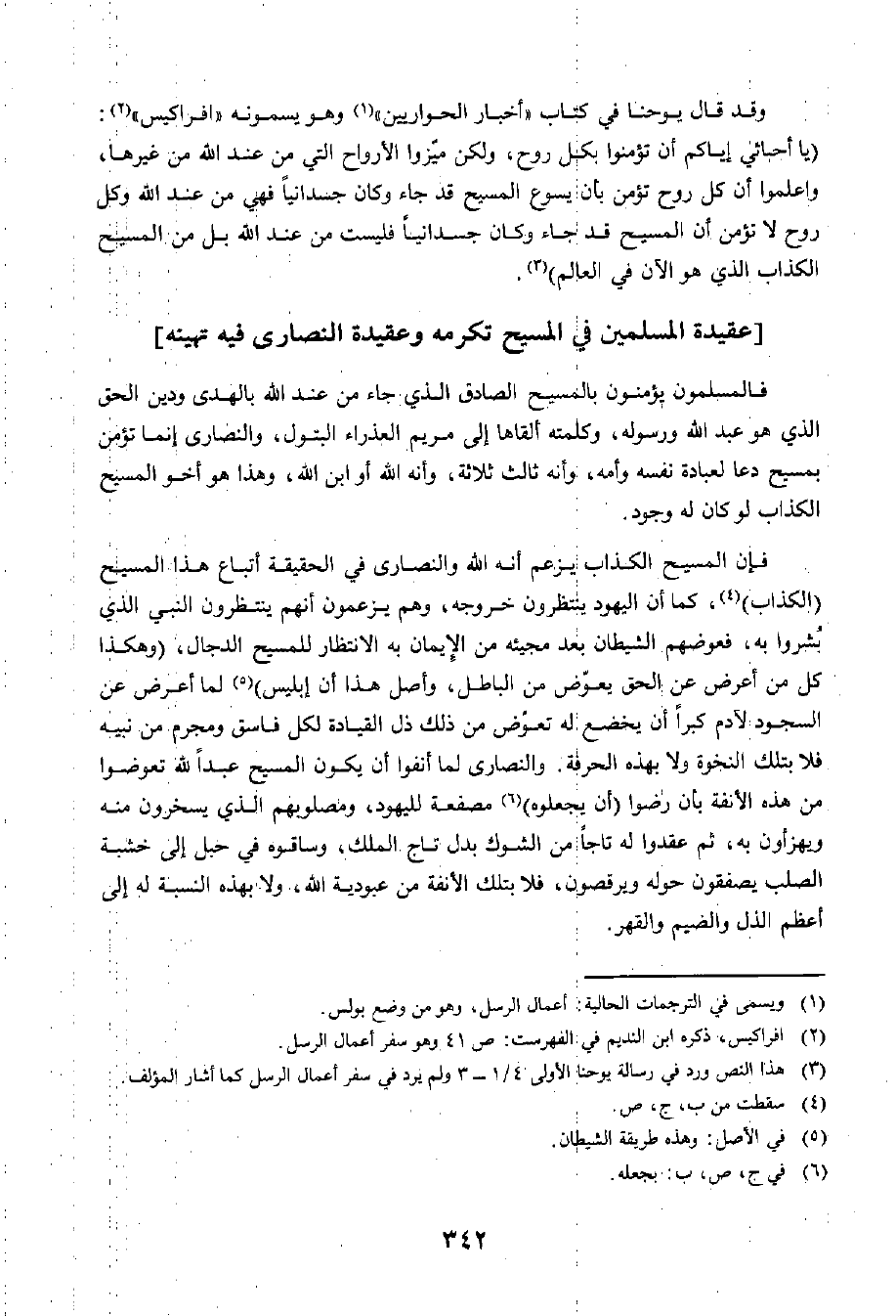 وَقَدْ قَالَ يُوحَنَّا فِي كِتَابِ أَخْبَارِ الْحَوَارِيِّينَ، وَهُوَ يُسَمُّونَهُ افْرَاكِيسَ: يَا أَحْبَابِي إِيَّاكُمْ أَنْ تُؤْمِنُوا بِكُلِّ رُوحٍ، لَكِنْ مَيِّزُوا الْأَرْوَاحَ الَّتِي مِنْ عِنْدِ اللَّهِ مِنْ غَيْرِهَا، وَاعْلَمُوا أَنَّ كُلَّ رُوحٍ تُؤْمِنُ بِأَنَّ يَسُوعَ الْمَسِيحَ قَدْ جَاءَ وَكَانَ جَسَدَانِيًّا فَهِيَ مِنْ عِنْدِ اللَّهِ، وَكُلُّ رُوحٍ لَا تُؤْمِنُ بِأَنَّ الْمَسِيحَ قَدْ جَاءَ وَكَانَ جَسَدَانِيًّا فَلَيْسَتْ مِنْ عِنْدِ اللَّهِ بَلْ مِنَ الْمَسِيحِ الْكَذَّابِ، الَّذِي هُوَ الْآنَ فِي الْعَالَمِ.