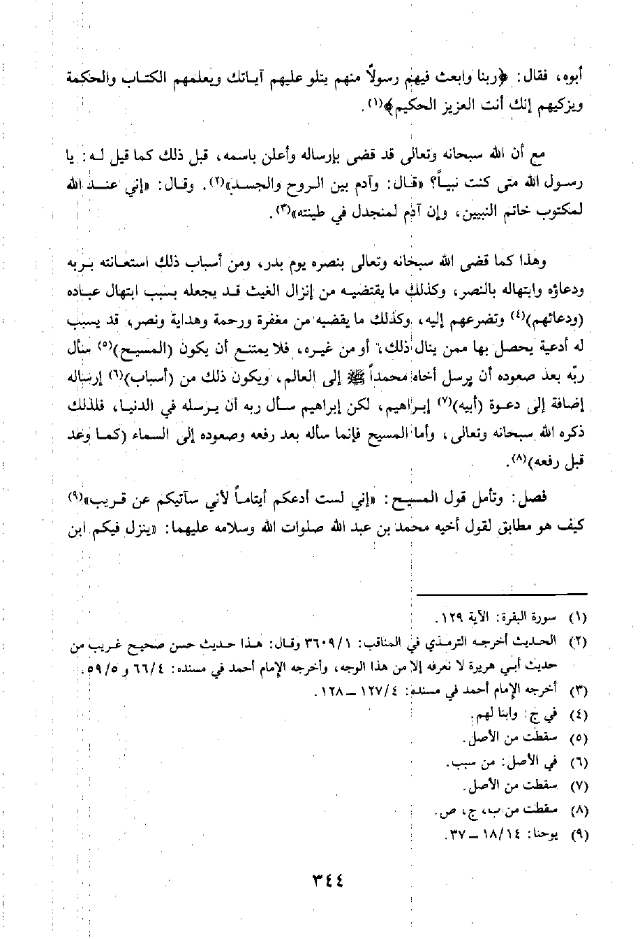 وَهَذَا كَمَا قَضَى اللَّهُ سُبْحَانَهُ وَتَعَالَى بِنَصْرِهِ يَوْمَ بَدْرٍ، وَمِنْ أَسْبَابِ ذَلِكَ اسْتِعَانَتُهُ بِرَبِّهِ وَدُعَاؤُهُ وَابْتِهَالُهُ بِالنَّصْرِ، وَكَذَلِكَ مَا يَقْتَضِيهِ مِنْ إِنْزَالِ الْغَيْثِ قَدْ يَجْعَلُهُ بِسَبَبِ ابْتِهَالِ عِبَادِهِ وَدُعَائِهِمْ وَتَضَرُّعِهِمْ إِلَيْهِ، وَكَذَلِكَ مَا يَقْضِيهِ مِنْ مَغْفِرَةٍ وَرَحْمَةٍ وَهِدَايَةٍ وَنَصْرٍ، قَدْ يُسَبِّبُ لَهُ أَدْعِيَةً يَحْصُلُ بِهَا مِمَّنْ يَنَالُ ذَلِكَ، أَوْ مِنْ غَيْرِهِ، فَلَا يَمْتَنِعُ أَنْ يَكُونَ الْمَسِيحُ سَأَلَ رَبَّهُ بَعْدَ صُعُودِهِ أَنْ يُرْسِلَ أَخَاهُ مُحَمَّدًا صَلَّى اللَّهُ عَلَيْهِ وَسَلَّمَ إِلَى الْعَالَمِ، وَيَكُونُ ذَلِكَ مِنْ أَسْبَابِ إِرْسَالِهِ، إِضَافَةً إِلَى دَعْوَةِ أَبِيهِ إِبْرَاهِيمَ، لَكِنَّ إِبْرَاهِيمَ سَأَلَ رَبَّهُ أَنْ يُرْسِلَهُ فِي الدُّنْيَا، فَلِذَلِكَ ذَكَرَهُ اللَّهُ سُبْحَانَهُ وَتَعَالَى، وَأَمَّا الْمَسِيحُ فَإِنَّمَا سَأَلَهُ بَعْدَ رَفْعِهِ وَصُعُودِهِ إِلَى السَّمَاءِ كَمَا وَعَدَ قَبْلَ رَفْعِهِ.