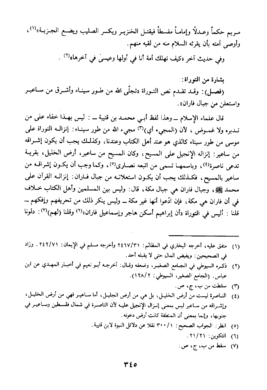قَالَ عُلَمَاءُ الْإِسْلَامِ - وَهَذَا لَفْظُ أَبِي مُحَمَّدِ بْنِ قُتَيْبَةَ - لَيْسَ بِهَذَا خَفَاءٌ عَلَى مَنْ تَدَبَّرَهُ وَلَا غُمُوضٌ، لِأَنَّ الْمَجِيءَ أَيْ مَجِيءُ اللَّهِ مِنْ طُورِ سَيْنَاءَ: إِنْزَالُهُ التَّوْرَاةَ عَلَى مُوسَى مِنْ طُورِ سَيْنَاءَ كَالَّذِي هُوَ عِنْدَ أَهْلِ الْكِتَابِ وَعِنْدَنَا، وَكَذَلِكَ يَجِبُ أَنْ يَكُونَ إِشْرَاقُهُ مِنْ سَاعِيرَ: إِنْزَالَهُ الْإِنْجِيلَ عَلَى الْمَسِيحِ، وَكَانَ الْمَسِيحُ مِنْ سَاعِيرَ، أَرْضِ الْخَلِيلِ، بِقَرْيَةٍ تُدْعَى نَاصِرَةَ، وَبِاسْمِهَا تَسَمَّى مَنِ اتَّبَعَهُ نَصَارَى، وَكَمَا وَجَبَ أَنْ يَكُونَ إِشْرَاقُهُ مِنْ سَاعِيرَ بِالْمَسِيحِ، فَكَذَلِكَ يَجِبُ أَنْ يَكُونَ اسْتِعْلَانُهُ مِنْ جِبَالِ فَارَانَ: إِنْزَالَهُ الْقُرْآنَ عَلَى مُحَمَّدٍ صَلَّى اللَّهُ عَلَيْهِ وَسَلَّمَ، وَجِبَالُ فَارَانَ هِيَ جِبَالُ مَكَّةَ، قَالَ: وَلَيْسَ بَيْنَ الْمُسْلِمِينَ وَأَهْلِ الْكِتَابِ خِلَافٌ فِي أَنَّ فَارَانَ هِيَ مَكَّةُ، فَإِنِ ادَّعَوْا أَنَّهَا غَيْرُ مَكَّةَ - وَلَيْسَ يُنْكَرُ ذَلِكَ مِنْ تَحْرِيفِهِمْ وَإِفْكِهِمْ - قُلْنَا: أَلَيْسَ فِي التَّوْرَاةِ " أَنَّ إِبْرَاهِيمَ أَسْكَنَ هَاجَرَ وَإِسْمَاعِيلَ فَارَانَ "؟! وَقُلْنَا لَهُمْ: دُلُّونَا