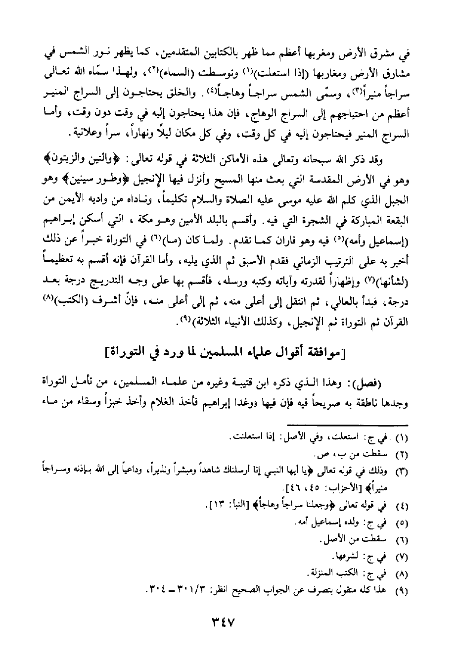 فِي مَشْرِقِ الْأَرْضِ وَمَغْرِبِهَا أَعْظَمَ مِمَّا ظَهَرَ بِالْكِتَابَيْنِ الْمُتَقَدِّمَيْنِ، كَمَا يَظْهَرُ نُورُ الشَّمْسِ فِي مَشَارِقِ الْأَرْضِ وَمَغَارِبِهَا إِذَا اسْتَعْلَتْ وَتَوَسَّطَتِ السَّمَاءَ، وَلِهَذَا سَمَّاهُ اللَّهُ تَعَالَى سِرَاجًا مُنِيرًا، وَسَمَّى الشَّمْسَ سِرَاجًا وَهَّاجًا، وَالْخَلْقُ يَحْتَاجُونَ إِلَى السِّرَاجِ الْمُنِيرِ أَعْظَمَ مِنْ حَاجَتِهِمْ إِلَى السِّرَاجِ الْوَهَّاجِ، فَإِنَّ هَذَا يَحْتَاجُونَ إِلَيْهِ فِي وَقْتٍ دُونَ وَقْتٍ، وَأَمَّا السِّرَاجُ الْمُنِيرُ فَيَحْتَاجُونَ إِلَيْهِ كُلَّ وَقْتٍ، وَفِي كُلِّ مَكَانٍ لَيْلًا وَنَهَارًا، سِرًّا وَعَلَانِيَةً.