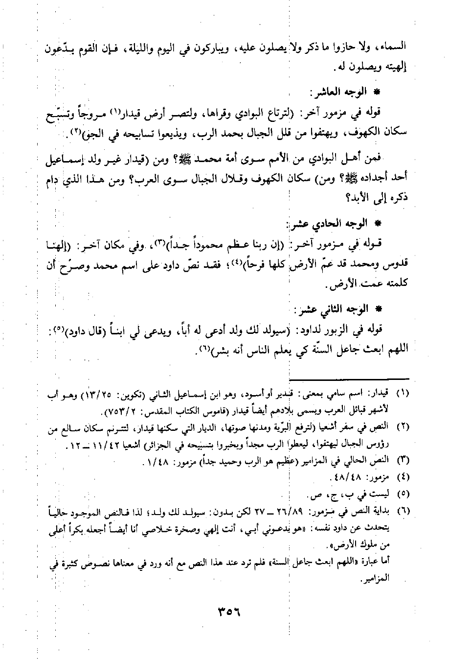 قَوْلُهُ فِي مَزْمُورٍ آخَرَ: إِنَّ رَبَّنَا عَظَّمَ مَحْمُودًا جِدًّا، وَفِي مَكَانٍ آخَرَ: إِلَهُنَا قُدُّوسٌ وَمُحَمَّدٌ قَدْ عَمَّ الْأَرْضَ كُلَّهَا فَرَحًا، فَقَدَ نَصَّ دَاوُدُ عَلَى اسْمِ مُحَمَّدٍ وَصَرَّحَ أَنَّ كَلِمَتَهُ عَمَّتِ الْأَرْضَ.