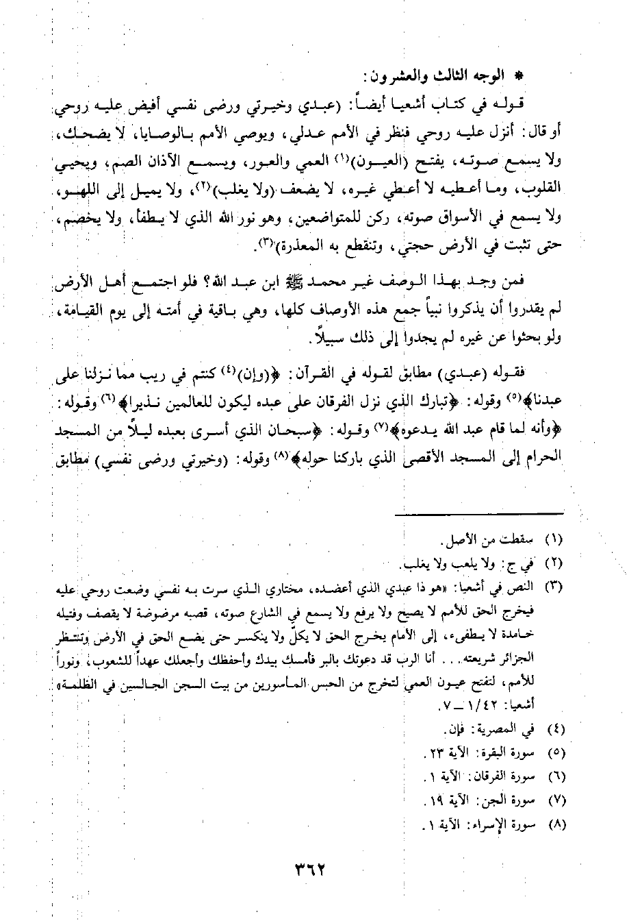 فَقَوْلُهُ عَبْدِي مُطَابِقٌ لِقَوْلِهِ فِي الْقُرْآنِ وَإِنْ كُنْتُمْ فِي رَيْبٍ مِمَّا نَزَّلْنَا عَلَى عَبْدِنَا، وَقَوْلِهِ تَبَارَكَ الَّذِي نَزَّلَ الْفُرْقَانَ عَلَى عَبْدِهِ لِيَكُونَ لِلْعَالَمِينَ نَذِيرًا، وَقَوْلُهُ وَأَنَّهُ لَمَّا قَامَ عَبْدُ اللَّهِ يَدْعُوهُ، وَقَوْلُهُ سُبْحَانَ الَّذِي أَسْرَى بِعَبْدِهِ لَيْلًا مِنَ الْمَسْجِدِ الْحَرَامِ إِلَى الْمَسْجِدِ الْأَقْصَى الَّذِي بَارَكْنَا حَوْلَهُ. وَقَوْلُهُ: وَخِيرَتِي وَرِضَى نَفْسِي، مُطَابِقٌ