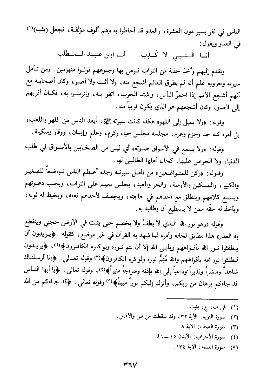 وَقَوْلُهُ: وَهُوَ نُورُ اللَّهِ الَّذِي لَا يُطْفَأُ وَلَا يُخْصَمُ حَتَّى يُثْبِتَ فِي الْأَرْضِ حُجَّتِي وَيَنْقَطِعَ بِهِ الْعُذْرُ، وَهَذَا مُطَابِقٌ لِحَالِهِ وَأَمْرِهِ لِمَا شَهِدَ بِهِ الْقُرْآنُ فِي غَيْرِ مَوْضِعٍ، كَقَوْلِهِ: يُرِيدُونَ أَنْ يُطْفِئُوا نُورَ اللَّهِ بِأَفْوَاهِهِمْ وَيَأْبَى اللَّهُ إِلَّا أَنْ يُتِمَّ نُورَهُ وَلَوْ كَرِهَ الْكَافِرُونَ، يُرِيدُونَ لِيُطْفِئُوا نُورَ اللَّهِ بِأَفْوَاهِهِمْ وَاللَّهُ مُتِمُّ نُورِهِ وَلَوْ كَرِهَ الْكَافِرُونَ وَقَوْلِهِ تَعَالَى: إِنَّا أَرْسَلْنَاكَ شَاهِدًا وَمُبَشِّرًا وَنَذِيرًا وَدَاعِيًا إِلَى اللَّهِ بِإِذْنِهِ وَسِرَاجًا مُنِيرًا، وَقَوْلِهِ تَعَالَى: يَاأَيُّهَا النَّاسُ قَدْ جَاءَكُمْ بُرْهَانٌ مِنْ رَبِّكُمْ وَأَنْزَلْنَا إِلَيْكُمْ نُورًا مُبِينًا وَقَوْلِهِ تَعَالَى: قَدْ جَاءَكُمْ مِنَ اللَّهِ نُورٌ وَكِتَابٌ مُبِينٌ يَهْدِي بِهِ اللَّهُ مَنِ اتَّبَعَ رِضْوَانَهُ سُبُلَ السَّلَامِ،
