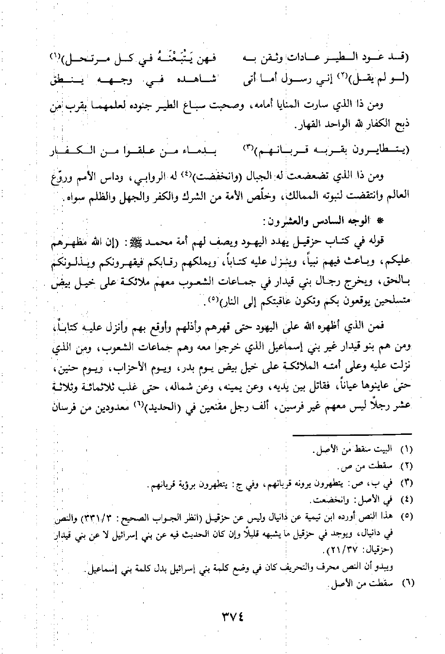 فَمَنِ الَّذِي أَظْهَرَهُ اللَّهُ عَلَى الْيَهُودِ حَتَّى قَهَرَهُمْ وَأَذَلَّهُمْ وَأَوْقَعَ بِهِمْ وَأَنْزَلَ عَلَيْهِ كِتَابًا؟ وَمَنْ هُمْ بَنُو قِيدَارَ غَيْرُ بَنِي إِسْمَاعِيلَ الَّذِي خَرَجُوا مَعَهُ وَهُمْ جَمَاعَاتُ الشُّعُوبِ؟ وَمَنِ الَّذِي نَزَلَتْ عَلَيْهِ وَعَلَى أُمَّتِهِ الْمَلَائِكَةُ عَلَى خَيْلٍ بِيضٍ يَوْمَ بَدْرٍ، وَيَوْمَ الْأَحْزَابِ، وَيَوْمَ حُنَيْنٍ، حَتَّى عَايَنُوهَا عِيَانًا، فَقَاتَلَ بَيْنَ يَدَيْهِ، وَعَنْ يَمِينِهِ، وَعَنْ شِمَالِهِ، حَتَّى غَلَبَ ثَلَاثُمِائَةٍ وَثَلَاثَةَ عَشَرَ رَجُلًا لَيْسَ مَعَهُمْ غَيْرُ فَرَسَيْنِ، أَلْفَ رَجُلٍ مُقَنَّعِينَ فِي الْحَدِيدِ مَعْدُودِينَ مِنْ فُرْسَانِ
