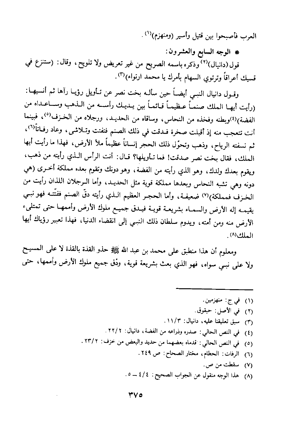 وَقَوْلُ دَانْيَالَ النَّبِيِّ أَيْضًا حِينَ سَأَلَهُ بُخْتَنَصَّرُ عَنْ تَأْوِيلِ رُؤْيَا رَآهَا ثُمَّ أُنْسِيَهَا: رَأَيْتَ أَيُّهَا الْمَلِكُ صَنَمًا عَظِيمًا قَائِمًا بَيْنَ يَدَيْكَ رَأَسُهُ مِنَ الذَّهَبِ، وَسَاعِدَاهُ مِنَ الْفِضَّةِ، وَبَطْنُهُ وَفَخِذُهُ مِنَ النُّحَاسِ، وَسَاقَاهُ مِنَ الْحَدِيدِ، وَرِجْلَاهُ مِنَ الْخَزَفِ، فَبَيْنَمَا أَنْتَ تَتَعَجَّبُ مِنْهُ إِذْ أَقْبَلَتْ صَخْرَةٌ فَدَقَّتْ فِي ذَلِكَ الصَّنَمِ فَتَفَتَّتَ وَتَلَاشَى، وَعَادَ رُفَاتًا، ثُمَّ نَسَفَتْهُ الرِّيَاحُ، وَذَهَبَ وَتَحَوَّلَ ذَلِكَ الْحَجَرُ إِنْسَانًا عَظِيمًا مَلَأَ الْأَرْضَ، فَهَذَا مَا رَأَيْتَ أَيُّهَا الْمَلِكُ، فَقَالَ بُخْتُنَصَّرُ: صَدَقْتَ، فَمَا تَأْوِيلُهَا؟ قَالَ: أَنْتَ الرَّأْسُ الَّذِي رَأَيْتَهُ مِنَ الذَّهَبِ، وَيَقُومُ بَعْدَكَ وَلَدُكَ، وَهُوَ الَّذِي رَأَيْتَهُ مِنَ الْفِضَّةِ، وَهُوَ دُونُكَ وَتَقُوُمُ بَعْدَهُ مَمْلَكَةٌ أُخْرَى هِيَ دُونَهُ وَهِيَ تُشْبِهُ النُّحَاسَ، وَبَعْدَهَا مَمْلَكَةٌ قَوِيَّةٌ مِثْلَ الْحَدِيدِ، وَأَمَّا الرِّجْلَانِ اللَّذَانِ رَأَيْتَ مِنْ خَزَفٍ فَمَمْلَكَةٌ ضَعِيفَةٌ، وَأَمَّا الْحَجَرُ الْعَظِيمُ الَّذِي رَأَيْتَهُ دَقَّ الصَّنَمَ فَفَتَّتَهُ فَهُوَ نَبِيٌّ يُقِيمُهُ إِلَهُ الْأَرْضِ وَالسَّمَاءِ بِشَرِيعَةٍ قَوِيَّةٍ فَيَدُقُّ جَمِيعَ مُلُوكِ الْأَرْضِ وَأُمَمِهَا حَتَّى تَمْتَلِئَ الْأَرْضُ مِنْهُ وَمِنْ أُمَّتِهِ، وَيَدُومُ سُلْطَانُ ذَلِكَ النَّبِيِّ إِلَى انْقِضَاءِ الدُّنْيَا، فَهَذَا تَعْبِيرُ رُؤْيَاكَ أَيُّهَا الْمَلِكُ.