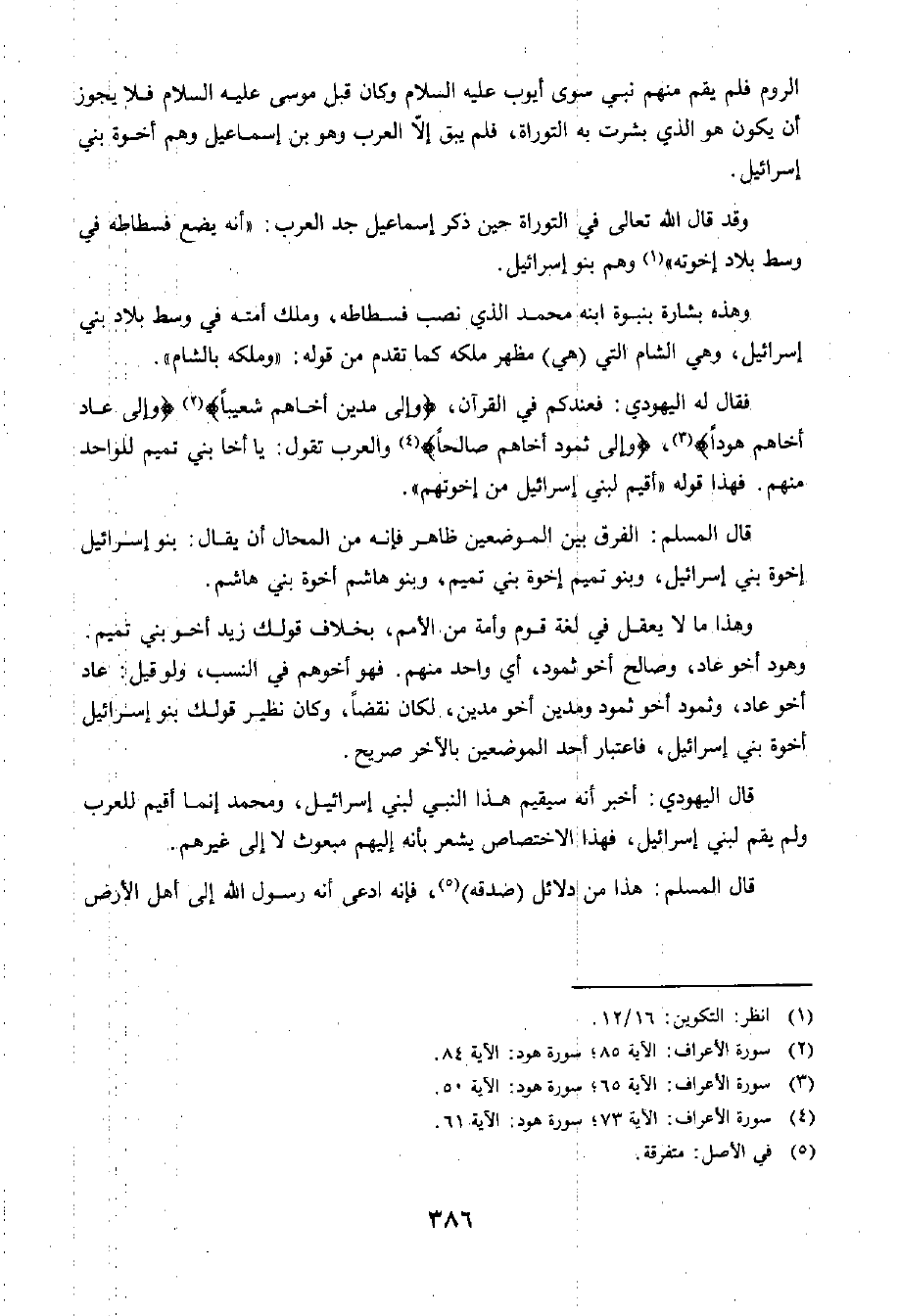 الرُّومُ فَلَمْ يَقُمْ مِنْهُمْ نَبِيٌّ سِوَى أَيُّوبَ عَلَيْهِ السَّلَامُ وَكَانَ قَبْلَ مُوسَى عَلَيْهِ السَّلَامُ فَلَا يَجُوزُ أَنْ يَكُونَ هُوَ الَّذِي بَشَّرَتْ بِهِ التَّوْرَاةُ، فَلَمْ يَبْقَ إِلَّا الْعَرَبُ وَهُوَ ابْنُ إِسْمَاعِيلَ وَهُمْ إِخْوَةُ بَنِي إِسْرَائِيلَ.