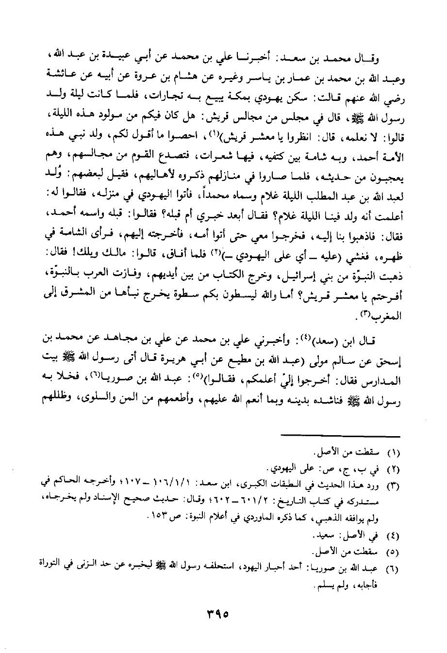وَقَالَ مُحَمَّدُ بْنُ سَعْدٍ: أَخْبَرَنَا عَلِيُّ بْنُ مُحَمَّدٍ، عَنْ أَبِي عُبَيْدَةَ بْنِ عَبْدِ اللَّهِ، وَعَبْدِ اللَّهِ بْنِ مُحَمَّدِ بْنِ عَمَّارِ بْنِ يَاسِرٍ وَغَيْرِهِ، عَنْ هِشَامِ بْنِ عُرْوَةَ، عَنْ أَبِيهِ، ... عَنْ عَائِشَةَ قَالَتْ: سَكَنَ يَهُودِيٌّ بِمَكَّةَ يَبِيعُ بِهَا تِجَارَاتٍ، فَلَمَّا كَانَتْ لَيْلَةُ وُلِدَ رَسُولُ اللَّهِ صَلَّى اللَّهُ عَلَيْهِ وَسَلَّمَ، قَالَ فِي مَجْلِسٍ مِنْ مَجَالِسِ قُرَيْشٍ: هَلْ كَانَ فِيكُمْ مِنْ مَوْلُودٍ هَذِهِ اللَّيْلَةَ؟ قَالُوا: لَا نَعْلَمُهُ، قَالَ: انْظُرُوا يَا مَعْشَرَ قُرَيْشٍ، احْصُوَا مَا أَقُولُ لَكُمْ، وَلِدَ نَبِيُّ هَذِهِ الْأُمَّةِ أَحْمَدُ، وَبِهِ شَامَةٌ بَيْنَ كَتِفَيْهِ، فِيهَا شَعَرَاتٌ، فَتَصَدَّعَ الْقَوْمُ مِنْ مَجَالِسِهِمْ، وَهُمْ يَعْجَبُونَ مِنْ حَدِيثِهِ، فَلَمَّا صَارُوا فِي مَنَازِلِهِمْ ذَكَرُوهُ لِأَهَالِيهِمْ، فَقِيلَ لِبَعْضِهِمْ: وُلِدَ لِعَبْدِ اللَّهِ بْنِ عَبْدِ الْمُطَّلِبِ اللَّيْلَةَ غُلَامٌ وَسَمَّاهُ مُحَمَّدًا، فَأَتَوُا الْيَهُودِيَّ فِي مَنْزِلِهِ فَقَالُوا لَهُ: أَعَلِمْتَ أَنَّهُ وُلِدَ فِينَا اللَّيْلَةَ غُلَامٌ؟ فَقَالَ: أَبَعْدَ خَبَرِي أَمْ قَبْلَهُ؟ فَقَالُوا: قَبْلَهُ، وَاسْمُهُ أَحْمَدُ، فَقَالَ: فَاذْهَبُوا بِنَا إِلَيْهِ، فَخَرَجُوا مَعِي حَتَّى أَتَوْا أُمَّهُ، فَأَخْرَجَتْهُ إِلَيْهِمْ، فَرَأَى الشَّامَةَ فِي ظَهْرِهِ، فَغُشِيَ عَلَيْهِ - أَيِ الْيَهُودِيُّ -، فَلَمَّا أَفَاقَ، قَالُوا: مَا لَكَ؟ وَيْلَكَ! فَقَالَ: ذَهَبَتِ النُّبُوَّةُ مِنْ بَنِي إِسْرَائِيلَ، وَخَرَجَ الْكِتَابُ مِنْ بَيْنِ أَيْدِيهِمْ، وَفَازَتِ الْعَرَبُ بِالنُّبُوَّةِ، أَفَرِحْتُمْ يَا مَعْشَرَ قُرَيْشٍ؟ أَمَا وَاللَّهِ لَيَسْطُوَنَّ بِكُمْ سَطْوَةً يَخْرُجُ نَبَؤُهَا مِنَ الْمَشْرِقِ إِلَى الْمَغْرِبِ....