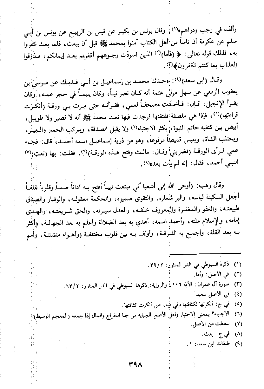 وَقَالَ ابْنُ سَعْدٍ: حَدَّثَنَا مُحَمَّدُ بْنُ إِسْمَاعِيلَ بْنِ أَبِي فُدَيْكٍ، عَنْ مُوسَى بْنِ يَعْقُوبَ الزَّمَعِيِّ، ... عَنْ سَهْلٍ مَوْلَى عَثْمَةَ أَنَّهُ كَانَ نَصْرَانِيًّا، وَكَانَ يَتِيمًا فِي حِجْرِ عَمِّهِ وَكَانَ يَقْرَأُ الْإِنْجِيلَ، قَالَ: فَأَخَذْتُ مُصْحَفًا لِعَمِّي فَقَرَأْتُهُ حَتَّى مَرَّتْ بِي وَرَقَةٌ أَنْكَرْتُ قِرَاءَتَهَا، فَإِذَا هِيَ مُلْصَقَةٌ فَفَتَقْتُهَا فَوَجَدْتُ فِيهَا نَعْتَ مُحَمَّدٍ صَلَّى اللَّهُ عَلَيْهِ وَسَلَّمَ أَنَّهُ لَا قَصِيرَ وَلَا طَوِيلَ، أَبْيَضَ بَيْنَ كَتِفَيْهِ خَاتَمُ النُّبُوَّةِ، يُكْثِرُ الِاجْتِبَاءَ وَلَا يَقْبَلُ الصَّدَقَةَ، وَيَرْكَبُ الْحِمَارَ وَالْبَعِيرَ، وَيَحْتَلِبُ الشَّاةَ، وَيَلْبَسُ قَمِيصًا مَرْقُوعًا، وَهُوَ مِنْ ذُرِّيَّةِ إِسْمَاعِيلَ اسْمُهُ أَحْمَدُ، قَالَ: فَجَاءَ عَمِّي فَرَأَى الْوَرَقَةَ فَضَرَبَنِي، وَقَالَ: مَا لَكَ وَفَتْحِ هَذِهِ الْوَرَقَةَ: فَقُلْتُ: فِيهَا نَعْتُ النَّبِيِّ أَحْمَدَ، فَقَالَ: إِنَّهُ لَمْ يَأْتِ بَعْدُ....