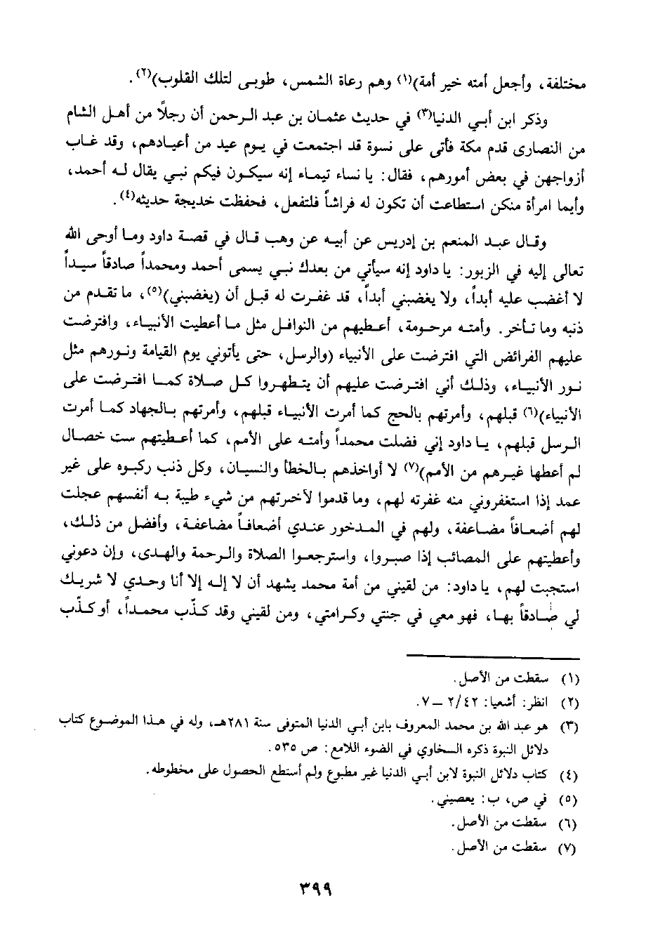 وَقَالَ عَبْدُ الْمُنْعِمِ بْنُ إِدْرِيسَ، عَنْ أَبِيهِ، ... عَنْ وَهْبٍ، قَالَ فِي قِصَّةِ دَاوُدَ، وَمَا أَوْحَى اللَّهُ تَعَالَى إِلَيْهِ فِي الزَّبُورِ: يَا دَاوُدُ، إِنَّهُ سَيَأْتِي مِنْ بَعْدَكَ نَبِيٌّ يُسَمَّى أَحْمَدَ وَمُحَمَّدًا، صَادِقًا سَيِّدًا، لَا أَغْضَبُ عَلَيْهِ أَبَدًا، وَلَا يُغْضِبُنِي أَبَدًا، قَدْ غَفَرْتُ لَهُ قَبْلَ أَنْ يُغْضِبَنِي مَا تَقَدَّمَ مِنْ ذَنْبِهِ وَمَا تَأَخَّرَ، وَأُمَّتُهُ مَرْحُومَةٌ، أُعْطِيهِمْ مِنَ النَّوَافِلِ مِثْلَ مَا أَعْطَيْتُ الْأَنْبِيَاءَ، وَافْتَرَضْتُ عَلَيْهِمُ الْفَرَائِضَ الَّتِي افْتَرَضْتُ عَلَى الْأَنْبِيَاءِ وَالرُّسُلِ، حَتَّى يَأْتُونِي يَوْمَ الْقِيَامَةِ وَنُورُهُمْ مِثْلَ نُورِ الْأَنْبِيَاءِ قَبْلَهُمْ، وَذَلِكَ أَنِّي افْتَرَضْتُ عَلَيْهِمْ أَنْ يَتَطَهَّرُوا كُلَّ صَلَاةٍ كَمَا افْتَرَضْتُ عَلَى الْأَنْبِيَاءِ قَبْلَهُمْ، وَأَمَرْتُهُمْ بِالْحَجِّ كَمَا أَمَرْتُ الْأَنْبِيَاءَ قَبْلَهُمْ، وَأَمَرْتُهُمْ بِالْجِهَادِ كَمَا أَمَرْتُ الرُّسُلَ قَبْلَهُمْ، يَا دَاوُدُ إِنِّي فَضَّلْتُ مُحَمَّدًا وَأُمَّتَّهُ عَلَى الْأُمَمِ كَمَا أَعْطَيْتُهُمْ سِتَّ خِصَالٍ لَمْ أُعْطِهَا غَيْرَهُمْ مِنَ الْأُمَمِ، لَا أُؤَاخِذُهُمْ بِالْخَطَأِ وَالنِّسْيَانِ، وَكُلُّ ذَنْبٍ رَكِبُوهُ عَلَى غَيْرِ عَمْدٍ إِذَا اسْتَغْفَرُونِي مِنْهُ غَفَرْتُهُ لَهُمْ، وَمَا قَدَّمُوا لِآخِرَتِهِمْ مِنْ شَيْءٍ، طَيِّبَةٌ بِهِ أَنْفُسُهُمْ، عَجَّلْتُ لَهُمْ أَضْعَافًا مُضَاعَفَةً، وَلَهُمْ عِنْدِي فِي الْمَدْخُورِ أَضْعَافًا مُضَاعِفَةً، وَأَفْضَلُ مِنْ ذَلِكَ، وَأَعْطَيْتُهُمْ عَلَى الْمَصَائِبِ إِذَا صَبَرُوا وَاسْتَرْجَعُوا الصَّلَاةَ وَالرَّحْمَةَ وَالْهُدَى، وَإِنْ دَعَوْنِي اسْتَجَبْتُ لَهُمْ، يَا دَاوُدُ، مَنْ لَقِيَنِي مِنْ أُمَّةِ مُحَمَّدٍ يَشْهَدُ أَنْ لَا إِلَهَ إِلَّا أَنَا وَحْدِي لَا شَرِيكَ لِي صَادِقًا بِهَا، فَهُوَ مَعِي فِي جَنَّتِي وَكَرَامَتِي، وَمَنْ لَقِيَنِي وَقَدْ كَذَّبَ مُحَمَّدًا أَوْ كَذَّبَ