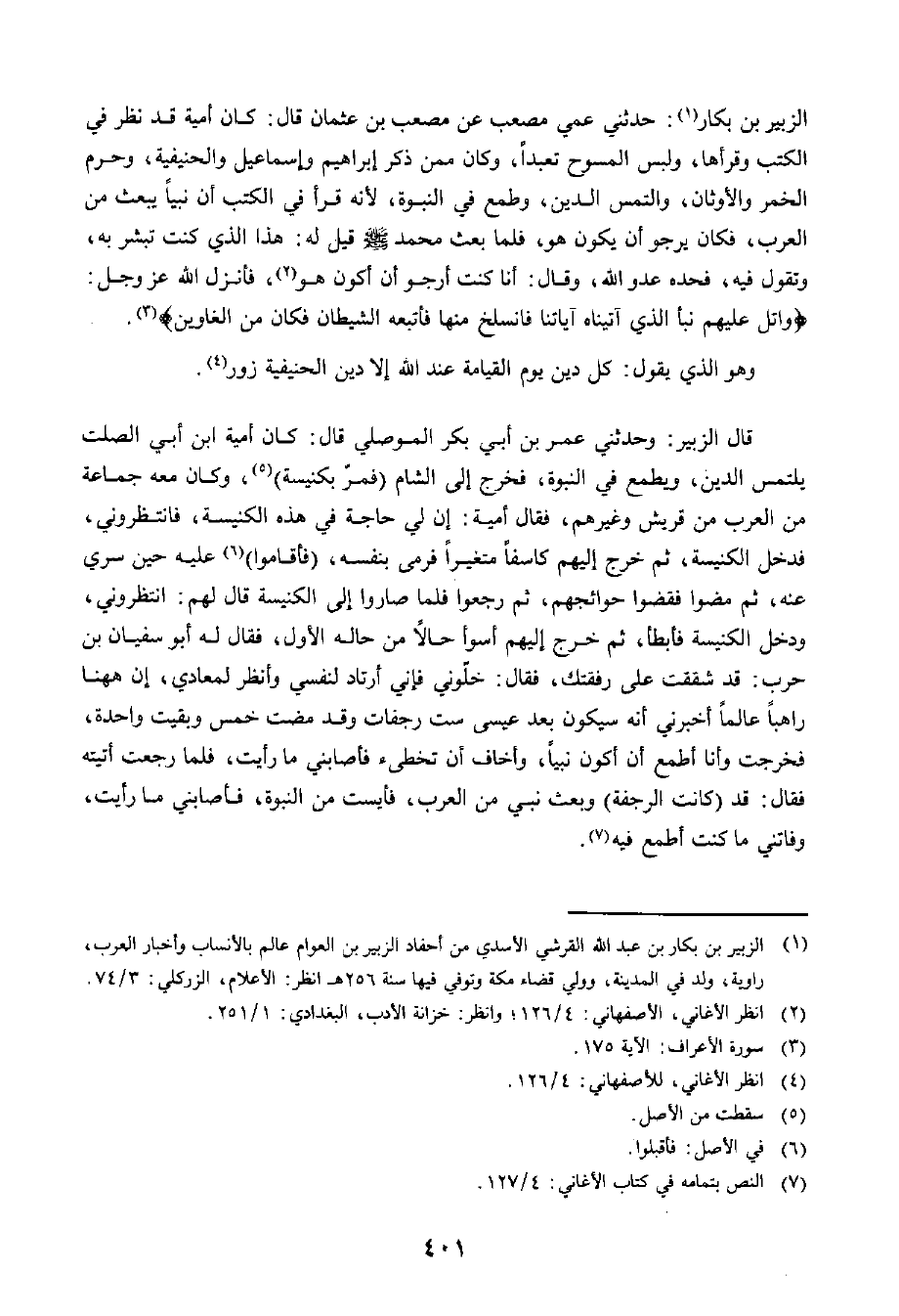 الزُّبَيْرُ بْنُ بِكَّارٍ: حَدَّثَنِي عَمِّي مُصْعَبٌ، عَنْ مُصْعَبِ بْنِ عُثْمَانَ، قَالَ: ... كَانَ أُمَيَّةُ قَدْ نَظَرَ فِي الْكُتُبِ وَقَرَأَهَا، وَلَبِسَ الْمُسُوحَ تَعَبُّدًا، وَكَانَ مِمَّنْ ذَكَرَ إِبْرَاهِيمَ وَإِسْمَاعِيلَ وَالْحَنِيفِيَّةَ، وَحَرَّمَ الْخَمْرَ وَالْأَوْثَانَ، وَالْتَمَسَ الدِّينَ، وَطَمَعَ فِي النُّبُوَّةِ لِأَنَّهُ قَرَأَ فِي الْكُتُبِ أَنَّ نَبِيًّا يُبْعَثُ مِنَ الْعَرَبِ، فَكَانَ يَرْجُو أَنْ يَكُونَ هُوَ، فَلَمَّا بَعَثَ اللَّهُ مُحَمَّدًا صَلَّى اللَّهُ عَلَيْهِ وَسَلَّمَ قِيلَ لَهُ: هَذَا الَّذِي كُنْتَ تُبَشِّرُ بِهِ، وَتَقُولُ فِيهِ، فَحَسَدَهُ عَدُوُّ اللَّهِ، وَقَالَ: أَنَا كُنْتُ أَرْجُوُ أَنْ أَكُونَ هُوَ، فَأَنْزَلَ اللَّهُ عَزَّ وَجَلَّ: وَاتْلُ عَلَيْهِمْ نَبَأَ الَّذِي آتَيْنَاهُ آيَاتِنَا فَانْسَلَخَ مِنْهَا فَأَتْبَعَهُ الشَّيْطَانُ فَكَانَ مِنَ الْغَاوِينَ.