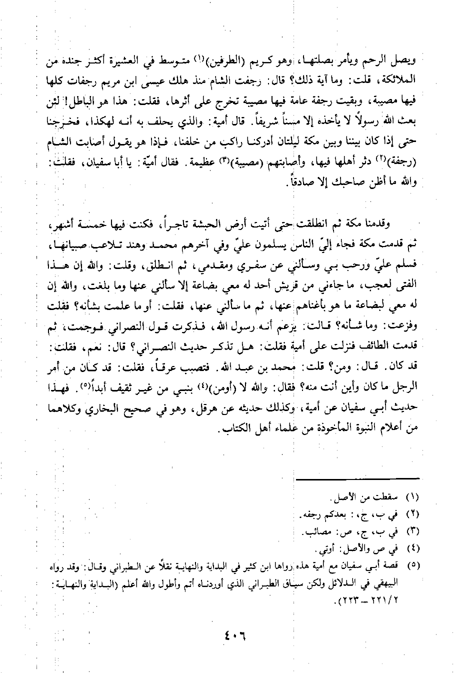 وَقَدِمْنَا مَكَّةَ ثُمَّ انْطَلَقْتُ حَتَّى أَتَيْتُ أَرْضَ الْحَبَشَةِ تَاجِرًا، وَكُنْتُ فِيهَا خَمْسَةَ أَشْهُرٍ، ثُمَّ قَدِمْتُ مَكَّةَ فَجَاءَ النَّاسُ يُسَلِّمُونَ عَلَيَّ وَفِي آخِرِهِمْ مُحَمَّدٌ وَهِنْدٌ تُلَاعِبُ صِبْيَانَهَا، فَسَلَّمَ عَلَيَّ وَرَحَّبَ بِي، وَسَأَلَنِي عَنْ سَفَرِي وَمَقْدِمِي، ثُمَّ انْطَلَقَ، وَقَلْتُ: وَاللَّهِ إِنَّ هَذَا الْفَتَى لَعَجَبٌ، مَا جَاءَنِي مِنْ قُرَيْشٍ أَحَدٌ لَهُ بِضَاعَةٌ إِلَّا سَأَلَنِي عَنْهَا وَمَا بَلَغَتْ، وَاللَّهِ إِنَّ لَهُ مَعِي لَبِضَاعَةً مَا هُوَ بِأَغْنَاهُمْ عَنْهَا ثُمَّ مَا سَأَلَنِي عَنْهَا. فَقَالَتْ: أَوَمَا عَلِمْتَ بِشَأْنِهِ؟ فَقَلْتُ - وَفَزِعْتُ - وَمَا شَأْنُهُ؟ قَالَتْ: يَزْعُمُ أَنَّهُ رَسُولُ اللَّهِ، فَذَكَرْتُ قَوْلَ النَّصْرَانِيِّ فَوَجِمْتُ، ثُمَّ قَدِمْتُ الطَّائِفَ فَنَزَلْتُ عَلَى أُمَيَّةَ فَقُلْتُ: هَلْ تَذْكُرُ حَدِيثَ النَّصْرَانِيِّ؟ قَالَ: نَعَمْ، فَقُلْتُ: قَدْ كَانَ، قَالَ: وَمَنْ؟ قُلْتُ: مُحَمَّدُ بْنُ عَبْدِ اللَّهِ، فَتَصَبَّبَ عَرَقًا. فَقُلْتُ: قَدْ كَانَ مِنْ أَمْرِ الرَّجُلِ مَا كَانَ وَأَيْنَ أَنْتَ مِنْهُ؟ فَقَالَ: وَاللَّهِ لَا أُومِنُ بِنَبِيٍّ مِنْ غَيْرِ ثَقِيفٍ أَبَدًا.... فَهَذَا حَدِيثُ أَبِي سُفْيَانَ عَنْ أُمَيَّةَ، وَكَذَلِكَ حَدِيثُهُ عَنْ هِرَقْلَ، وَهُوَ فِي صَحِيحِ الْبُخَارِيِّ، وَكِلَاهُمَا مِنْ أَعْلَامِ النُّبُوَّةِ الْمَأْخُوذَةِ مِنْ عُلَمَاءِ أَهْلِ الْكِتَابِ.