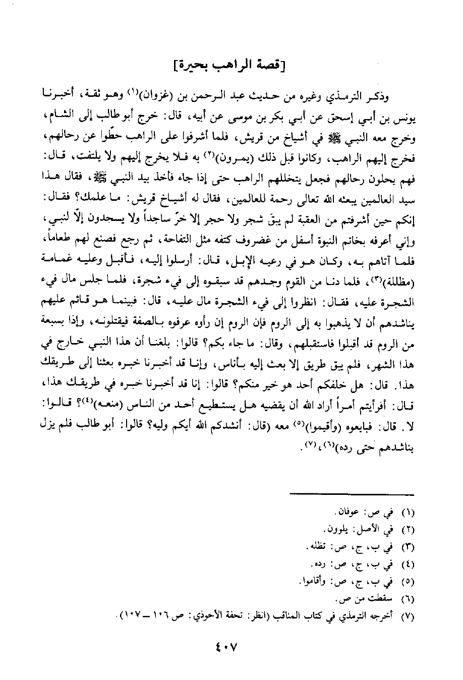 وَذَكَرَ التِّرْمِذِيُّ وَغَيْرُهُ مِنْ حَدِيثِ عَبْدِ الرَّحْمَنِ بْنِ غَزَوَانَ وَهُوَ ثِقَةٌ: أَخْبَرَنَا يُونُسُ بْنُ أَبِي إِسْحَاقَ، عَنْ أَبِي بَكْرِ بْنِ مُوسَى، عَنْ أَبِيهِ، قَالَ: خَرَجَ أَبُو طَالِبٍ إِلَى الشَّامِ وَخَرَجَ مَعَهُ النَّبِيُّ صَلَّى اللَّهُ عَلَيْهِ وَسَلَّمَ فِي أَشْيَاخٍ مِنْ قُرَيْشٍ، فَلَمَّا أَشْرَفُوا عَلَى الرَّاهِبِ حَطُّوا عَنْ رِحَالِهِمْ فَخَرَجَ إِلَيْهِمُ الرَّاهِبُ وَكَانُوا قَبْلَ ذَلِكَ يَمُرُّونَ بِهِ فَلَا يَخْرُجُ إِلَيْهِمْ وَلَا يَلْتَفِتُ. قَالَ: فَهُمْ يُحِلُّونَ رِحَالَهُمْ فَجَعَلَ يَتَخَلَّلُهُمُ الرَّاهِبُ حَتَّى إِذَا جَاءَ فَأَخَذَ بِيَدِ النَّبِيِّ صَلَّى اللَّهُ عَلَيْهِ وَسَلَّمَ، فَقَالَ: هَذَا سَيِّدُ الْعَالَمِينَ، هَذَا يَبْعَثُهُ اللَّهُ تَعَالَى رَحْمَةً لِلْعَالَمِينَ، فَقَالَ لَهُ أَشْيَاخُ قُرَيْشٍ: مَا عِلْمُكَ؟ فَقَالَ: إِنَّكُمْ حِينَ أَشْرَفْتُمْ مِنَ الْعَقَبَةِ لَمْ يَبْقَ شَجَرٌ وَلَا حَجَرٌ إِلَّا خَرَّ سَاجِدًا، وَلَا يَسْجُدُونَ إِلَّا لِنَبِيٍّ، وَإِنِّي أَعْرِفُهُ بِخَاتَمِ النُّبُوَّةِ أَسْفَلَ مِنْ غُضْرُوفِ كَتِفِهِ مِثْلَ التُّفَّاحَةِ، ثُمَّ رَجَعَ فَصَنَعَ لَهُمْ طَعَامًا، فَلَمَّا أَتَاهُمْ بِهِ، وَكَانَ هُوَ فِي رَعِيَّةِ الْإِبِلِ، قَالَ: أَرْسِلُوا إِلَيْهِ، فَأَقْبَلَ وَعَلَيْهِ غَمَامَةٌ مُظَلِّلَةٌ، فَلَمَّا دَنَا مِنَ الْقَوْمِ وَجَدَهُمْ قَدْ سَبَقُوهُ إِلَى فَيْءِ شَجَرَةٍ، فَلَمَّا جَلَسَ مَالَ فَيْءُ الشَّجَرَةِ عَلَيْهِ، فَقَالَ: انْظُرُوا إِلَى فَيْءِ الشَّجَرَةِ مَالَ عَلَيْهِ. قَالَ: فَبَيْنَمَا هُوَ قَائِمٌ عَلَيْهِمْ يُنَاشِدُهُمْ أَنْ لَا يَذْهَبُوا بِهِ إِلَى الرُّومِ فَإِنَّ الرُّومَ إِنْ رَأَوْهُ عَرَفُوهُ بِالصِّفَةِ فَيَقْتُلُونَهُ، وَإِذَا بِسَبْعَةٍ مِنَ الرُّومِ قَدْ أَقْبَلُوا فَاسْتَقْبَلَهُمْ، وَقَالَ: مَا جَاءَ بِكُمْ؟ قَالُوا: بَلَغَنَا أَنَّ هَذَا النَّبِيَّ خَارِجٌ فِي هَذَا الشَّهْرِ، فَلَمْ يَبْقَ طَرِيقٌ إِلَّا بُعِثَ إِلَيْهِ بِأُنَاسٍ، وَإِنَّا قَدْ أُخْبِرْنَا خَبَرَهُ فِي طَرِيقِكَ هَذَا، قَالَ: أَفَرَأَيْتُمْ أَمْرًا أَرَادَ اللَّهُ أَنْ يَقْضِيَهُ فَهَلْ يَسْتَطِيعُ أَحَدٌ مِنَ النَّاسِ مَنْعَهُ؟ قَالُوا: لَا، قَالَ: فَبَايِعُوهُ وَأَقِيمُوا مَعَهُ، قَالَ: أَنْشُدُكُمُ اللَّهَ أَيُّكُمْ وَلِيُّهُ؟ قَالُوا: أَبُو طَالِبٍ، فَلَمْ يَزَلْ يُنَاشِدُهُمْ حَتَّى رَدَّهُ.