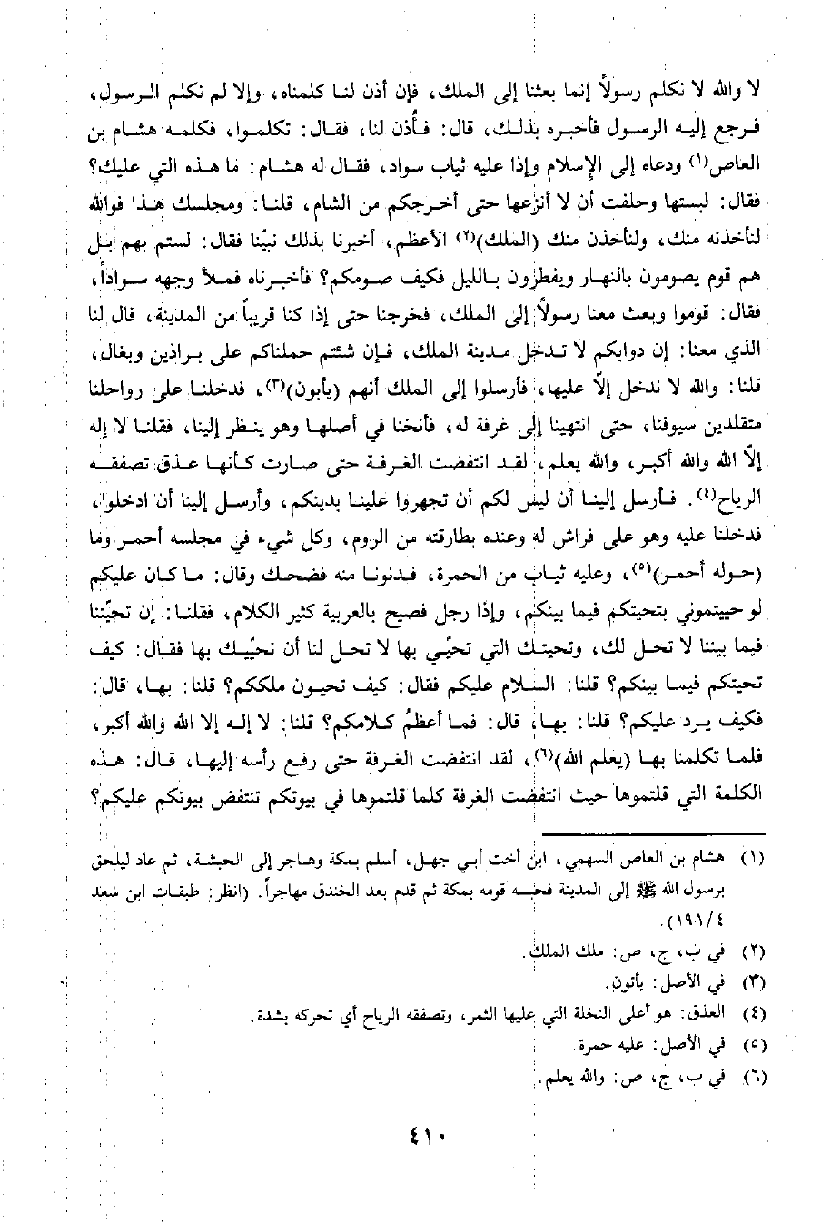 لَا وَاللَّهِ لَا نُكَلِّمُ رَسُولًا إِنَّمَا بُعِثْنَا إِلَى الْمَلِكِ، فَإِنْ أَذِنَ لَنَا كَلَّمْنَاهُ، وَإِلَّا لَمْ نُكَلِّمِ الرَّسُولَ، فَرَجَعَ إِلَيْهِ الرَّسُولُ فَأَخْبَرَهُ بِذَلِكَ، قَالَ: فَأَذِنَ لَنَا، فَقَالَ: تَكَلَّمُوا. فَكَلَّمَهُ هِشَامُ بْنُ الْعَاصِ وَدَعَاهُ إِلَى الْإِسْلَامِ وَإِذَا عَلَيْهِ ثِيَابٌ سَوَادٌ، فَقَالَ لَهُ هِشَامٌ: مَا هَذِهِ الَّتِي عَلَيْكَ؟ فَقَالَ لَبِسْتُهَا وَحَلَفْتُ أَنْ لَا أَنْزَعَهَا حَتَّى أُخْرِجَكُمْ مِنَ الشَّامِ، قُلْنَا: وَمَجْلِسُكَ هَذَا فَوَاللَّهِ لَنَأْخُذَنَّهُ مِنْكَ، وَلَنَأْخُذَنَّ مِنْكَ الْمُلْكَ الْأَعْظَمَ، أَخْبَرَنَا بِذَلِكَ نَبِيُّنَا، فَقَالَ: لَسْتُمْ بِهِمْ، بَلْ هُمْ قَوْمٌ يَصُومُونَ بِالنَّهَارِ وَيُفْطِرُونَ بِاللَّيْلِ فَكَيْفَ صَوْمُكُمْ؟ فَأَخْبَرْنَاهُ فَمُلِئَ وَجْهُهُ سَوَادًا، فَقَالَ: قُومُوا. وَبَعَثَ رَسُولًا إِلَى الْمَلِكِ فَخَرَجْنَا حَتَّى إِذَا كُنَّا قَرِيبًا مِنَ الْمَدِينَةِ، قَالَ لَنَا الَّذِي مَعَنَا: إِنَّ دَوَابَّكُمْ هَذِهِ لَا تَدْخُلُ مَدِينَةَ الْمَلِكِ، فَإِنْ شِئْتُمْ حَمَلْنَاكُمْ عَلَى بَرَاذِينَ وَبِغَالٍ، قُلْنَا: وَاللَّهِ لَا نَدْخُلُ إِلَّا عَلَيْهَا، فَأَرْسَلُوا إِلَى الْمَلِكِ أَنَّهُمْ يَأْبَوْنَ، فَدَخَلْنَا عَلَى رَوَاحِلِنَا مُتَقَلِّدَيْنِ سُيُوفَنَا حَتَّى انْتَهَيْنَا إِلَى غُرْفَةٍ لَهُ، فَأَنَخْنَا فِي أَصْلِهَا وَهُوَ يَنْظُرُ إِلَيْنَا، فَقُلْنَا: لَا إِلَهَ إِلَّا اللَّهُ وَاللَّهُ أَكْبَرُ. وَاللَّهُ يَعْلَمُ لَقَدِ انْتَفَضَتِ الْغُرْفَةُ حَتَّى صَارَتْ كَأَنَّهَا عَذْقٌ تُصَفِّقُهُ الرِّيَاحُ. فَأَرْسَلَ إِلَيْنَا: لَيْسَ لَكُمْ أَنْ تَجْهَرُوا عَلَيْنَا بِدِينِكُمْ، وَأَرْسَلَ إِلَيْنَا أَنِ ادْخُلُوا، فَدَخَلْنَا عَلَيْهِ وَهُوَ عَلَى فِرَاشٍ لَهُ وَعِنْدَهُ بَطَارِقَتُهُ مِنَ الرُّومِ، وَكُلُّ شَيْءٍ فِي مَجْلِسِهِ أَحْمَرُ وَمَا حَوْلَهُ أَحْمَرُ، وَعَلَيْهِ ثِيَابٌ مِنَ الْحُمْرَةِ، فَدَنَوْنَا مِنْهُ فَضَحِكَ، وَقَالَ: مَا كَانَ عَلَيْكُمْ لَوْ حَيَّيْتُمُونِي بِتَحِيَّتِكُمْ فِيمَا بَيْنَكُمْ؟ وَإِذَا رَجُلٌ فَصِيحٌ بِالْعَرَبِيَّةِ كَثِيرُ الْكَلَامِ، فَقُلْنَا: إِنَّ تَحِيَّتَنَا فِيمَا بَيْنَنَا لَا تَحِلُّ لَكَ، وَتَحِيَّتُكَ الَّتِي تُحَيَّى بِهَا لَا تَحِلُّ لَنَا أَنْ نُحَيِّيَكَ بِهَا، فَقَالَ: كَيْفَ تَحِيَّتُكُمْ فِيمَا بَيْنَكُمْ؟ قُلْنَا: السَّلَامُ عَلَيْكُمْ. فَقَالَ: كَيْفَ تُحَيُّونَ مَلِكَكُمْ، قُلْنَا: بِهَا، قَالَ: فَكَيْفَ يَرُدُّ عَلَيْكُمْ؟ قُلْنَا: بِهَا، قَالَ: فَمَا أَعْظَمُ كَلَامَكُمْ؟ قُلْنَا: لَا إِلَهَ إِلَّا اللَّهُ وَاللَّهُ أَكْبَرُ. فَلَمَّا تَكَلَّمْنَا بِهَا - يَعْلَمُ اللَّهُ - لَقَدِ انْتَفَضَتِ الْغُرْفَةُ حَتَّى رَفَعَ رَأْسَهُ إِلَيْهَا، قَالَ: هَذِهِ الْكَلِمَةُ الَّتِي قُلْتُمُوهَا حَيْثُ انْتَفَضَتِ الْغُرْفَةُ، كُلَّمَا قُلْتُمُوهَا فِي بُيُوتِكُمْ تَنْتَفِضُ بُيُوتُكُمْ عَلَيْكُمْ؟