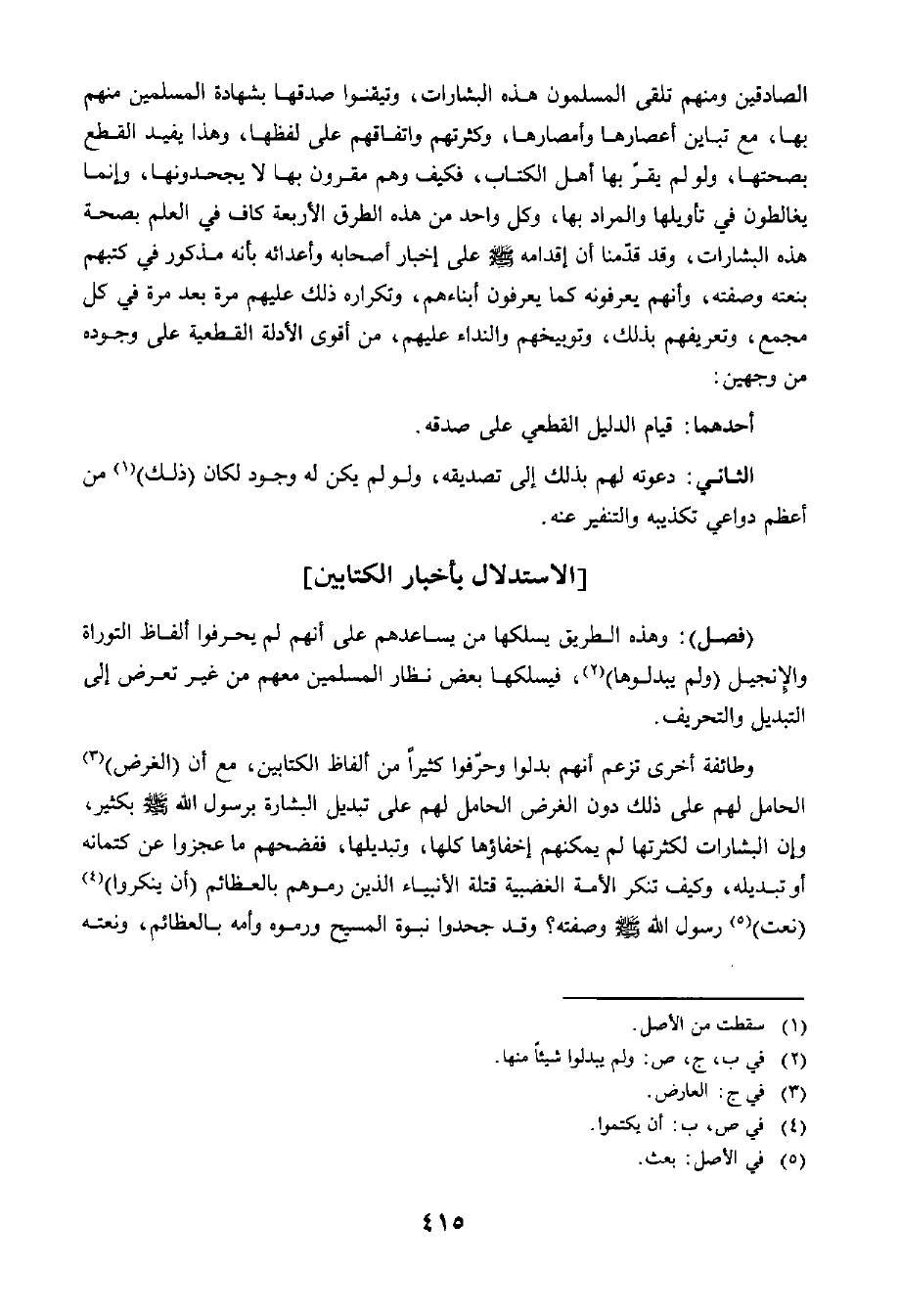 الصَّادِقِينَ مِنْهُمْ تَلَقَّى الْمُسْلِمُونَ هَذِهِ الْبِشَارَاتِ وَتَيَقَّنُوا صِدْقَهَا بِشَهَادَةِ الْمُسْلِمِينَ مِنْهُمْ بِهَا، مَعَ تَبَايُنِ أَعْصَارِهَا وَأَمْصَارِهَا وَكَثْرَتِهِمْ وَاتِّفَاقِهِمْ عَلَى لَفْظِهَا، وَهَذَا يُفِيدُ الْقَطْعَ بِصِحَّتِهَا وَلَوْ لَمْ يُقِرَّ بِهَا أَهْلُ الْكِتَابِ، فَكَيْفَ وَهَمَ مُقِرُّونَ بِهَا لَا يَجْحَدُونَهَا وَإِنَّمَا يُغَالِطُونَ فِي تَأْوِيلِهَا وَالْمُرَادِ بِهَا؟! وَكُلٌّ وَاحِدٍ مِنْ هَذِهِ الطُّرُقِ الْأَرْبَعَةِ كَافٍ فِي الْعِلْمِ بِصِحَّةِ هَذِهِ الْبِشَارَاتِ، وَقَدْ قَدَّمْنَا أَنَّ إِقْدَامَهُ صَلَّى اللَّهُ عَلَيْهِ وَسَلَّمَ عَلَى إِخْبَارِ أَصْحَابِهِ وَأَعْدَائِهِ بِأَنَّهُ مَذْكُورٌ فِي كُتُبِهِمْ بِنَعْتِهِ وَصِفَتِهِ، وَأَنَّهُمْ يَعْرِفُونَهُ كَمَا يَعْرِفُونَ أَبِنَاهِمْ، وَتَكْرَارَهُ ذَلِكَ عَلَيْهِمْ مَرَّةً بَعْدَ مَرَّةٍ فِي كُلِّ مَجْمَعٍ وَتَعْرِيفَهُمْ بِذَلِكَ، وَتَوْبِيخَهُمْ وَالنِّدَاءَ عَلَيْهِمْ، مِنْ أَقْوَى الْأَدِلَّةِ الْقَطْعِيَّةِ عَلَى وُجُودِهِ مِنْ وَجْهَيْنِ: