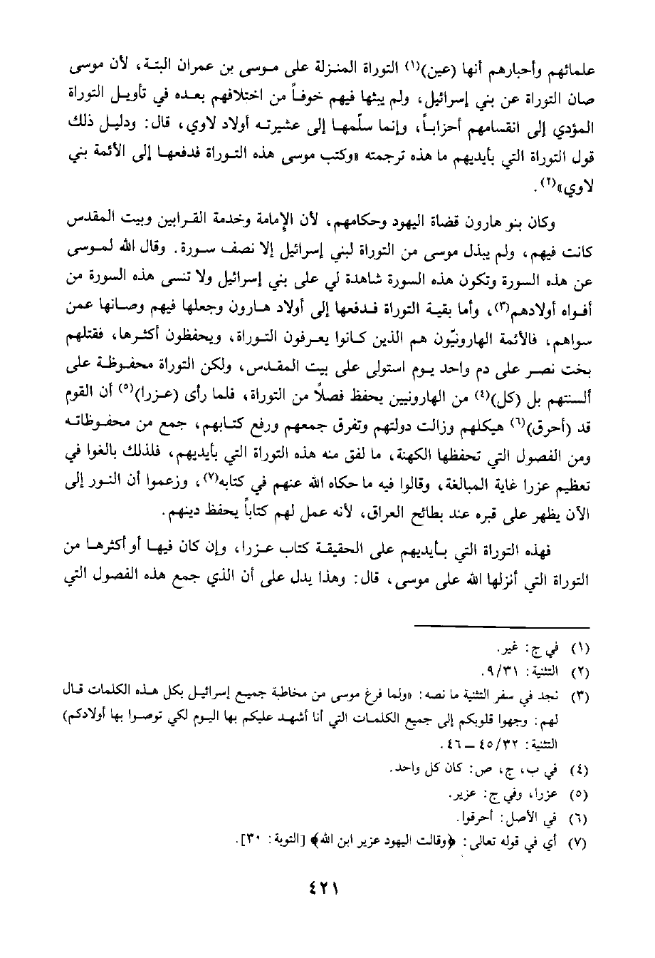 عُلَمَائِهِمْ وَأَحْبَارِهِمْ أَنَّهَا عَيْنُ التَّوْرَاةِ الْمُنَزَّلَةِ عَلَى مُوسَى بْنِ عِمْرَانَ أَلْبَتَّةَ، لِأَنَّ مُوسَى صَانَ التَّوْرَاةَ عَنْ بَنِي إِسْرَائِيلَ، وَلَمْ يَبُثَّهَا فِيهِمْ خَوْفًا مِنِ اخْتِلَافِهِمْ مِنْ بَعْدِهِ فِي تَأْوِيلِ التَّوْرَاةِ الْمُؤَدِّي إِلَى انْقِسَامِهِمْ أَحْزَابًا، وَإِنَّمَا سَلَّمَهَا إِلَى عَشِيرَتِهِ أَوْلَادِ لَاوِي، قَالَ: وَدَلِيلُ ذَلِكَ قَوْلُ التَّوْرَاةِ مَا هَذِهِ تَرْجَمَتُهُ: وَكَتَبَ مُوسَى هَذِهِ التَّوْرَاةَ وَدَفَعَهَا إِلَى الْأَئِمَّةِ بَنِي لَاوِي.