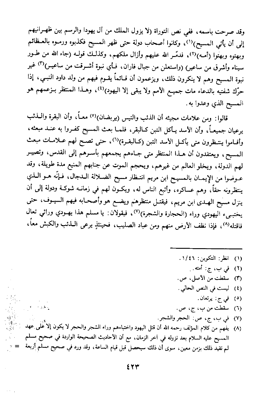 قَالُوا: وَمِنْ عَلَامَةِ مَجِيئِهِ أَنَّ الذِّئْبَ وَالتَّيْسَ يَرْبِضَانِ مَعًا، وَأَنَّ الْبَقَرَةَ وَالذِّئْبَ يَرْعَيَانِ جَمِيعًا، وَأَنَّ الْأَسَدَ يَأْكُلُ التِّبْنَ كَالْبَقَرِ. فَلَمَّا بُعِثَ الْمَسِيحُ كَفَرُوا بِهِ عِنْدَ مَبْعَثِهِ. وَأَقَامُوا يَنْتَظِرُونَ مَتَى يَأْكُلُ الْأَسَدُ التِّبْنَ (كَالْبَقَرَةِ) ، حَتَّى تَصِحَّ لَهُمْ عَلَامَاتُ مَبْعَثِ الْمَسِيحِ، وَيَعْتَقِدُونَ أَنَّ هَذَا الْمُنْتَظَرَ مَتَى جَاءَهُمْ يَجْمَعُهُمْ بِأَسْرِهِمْ إِلَى الْقُدْسِ، وَتَصِيرُ لَهُمُ الدَّوْلَةُ، وَيَخْلُو الْعَالَمُ مِنْ غَيْرِهِمْ، وَيُحْجِمُ الْمَوْتُ عَنْ جَنَابِهِمُ الْمَنِيعِ مُدَّةً طَوِيلَةً، وَقَدْ عُوِّضُوا مِنَ الْإِيمَانِ بِالْمَسِيحِ ابْنِ مَرْيَمَ انْتِظَارَ مَسِيحِ الضَّلَالَةِ الدَّجَّالِ، فَإِنَّهُ هُوَ الَّذِي يَنْتَظِرُونَهُ حَقًّا، وَهُمْ عَسَاكِرُهُ وَأَتْبَعُ النَّاسِ لَهُ، وَيَكُونُ لَهُمْ فِي زَمَانِهِ شَوْكَةٌ وَدَوْلَةٌ إِلَى أَنْ يَنْزِلَ مَسِيحُ الْهُدَى ابْنُ مَرْيَمَ فَيَقْتُلَ مُنْتَظَرَهُمْ، وَيَضَعُ هُوَ وَأَصْحَابُهُ فِيهِمُ السُّيُوفَ حَتَّى يَخْتَبِئَ الْيَهُودِيُّ وَرَاءَ الْحَجَرِ وَالشَّجَرِ فَيَقُولَانِ: يَا مُسْلِمُ، هَذَا يَهُودِيٌّ وَرَائِي تَعَالَى فَاقْتُلْهُ. فَإِذَا نَظَّفَ الْأَرْضَ مِنْهُمْ وَمِنْ عُبَّادِ الصَّلِيبِ فَحِينَئِذٍ يَرْعَى الذِّئْبُ وَالْكَبْشُ مَعًا،