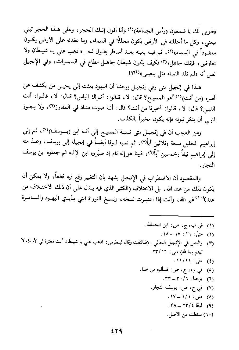 طُوبَى لَكَ يَا شَمْعُونُ (رَأْسَ الْجَمَاعَةِ) ، وَأَنَا أَقُولُ إِنَّكَ الْحَجَرُ، وَعَلَى هَذَا الْحَجَرِ تَبْنِي بِيعَتِي، وَكُلُّ مَا أَحْلَلْتَهُ فِي الْأَرْضِ يَكُونُ مُحَلَّلًا فِي السَّمَاءِ، وَمَا عَقَدْتَهُ عَلَى الْأَرْضِ يَكُونُ مَعْقُودًا فِي السَّمَاءِ، ثُمَّ فِيهِ بِعَيْنِهِ بَعْدَ أَسْطُرٍ يَقُولُ لَهُ: اذْهَبْ عَنِّي يَا شَيْطَانُ وَلَا تُعَارِضْ، فَإِنَّكَ جَاهِلٌ، فَكَيْفَ يَكُونُ شَيْطَانٌ جَاهِلٌ مُطَاعٌ فِي السَّمَاوَاتِ. وَفِي الْإِنْجِيلِ نَصٌّ أَنَّهُ، ((لَمْ تَلِدِ النِّسَاءُ مِثْلَ يَحْيَى))