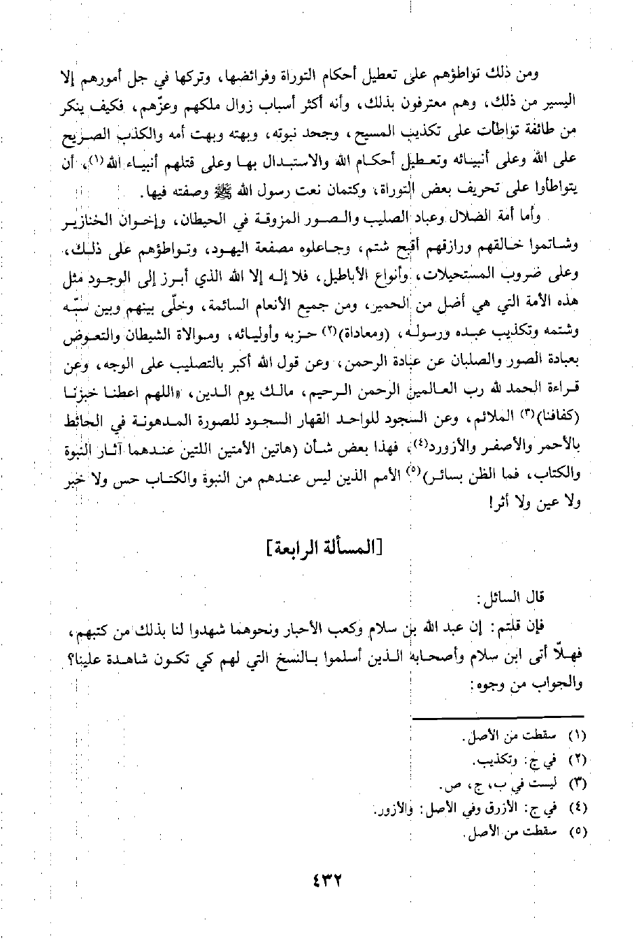 فَإِنْ قُلْتُمْ: إِنَّ عَبْدَ اللَّهِ بْنَ سَلَامٍ، وَكَعْبَ الْأَحْبَارِ، وَنَحْوَهُمَا شَهِدُوا لَنَا بِذَلِكَ مِنْ كُتُبِهِمْ، فَهَلَّا أَتَى ابْنُ سَلَامٍ وَأَصْحَابُهُ الَّذِينَ أَسْلَمُوا بِالنُّسَخِ الَّتِي لَهُمْ كَيْ تَكُونَ شَاهِدَةً عَلَيْنَا؟ وَالْجَوَابُ مِنْ وُجُوهٍ: