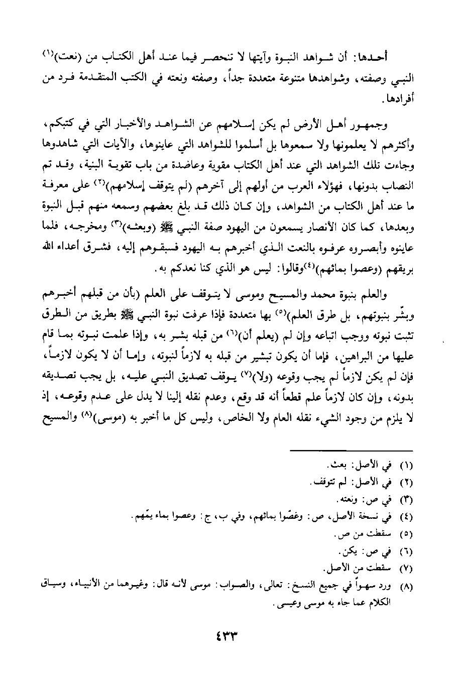 وَالْعِلْمُ بِنُبُوَّةِ مُحَمَّدٍ وَالْمَسِيحِ وَمُوسَى لَا يَتَوَقَّفُ عَلَى الْعِلْمِ بِأَنَّ مَنْ قَبْلَهُمْ أَخْبَرَهُمْ وَبَشَّرَ بِنُبُوَّتِهِمْ، بَلْ طُرُقُ الْعِلْمِ بِهَا مُتَعَدِّدَةٌ، فَإِذَا عُرِفَتْ نُبُوَّةُ النَّبِيِّ صَلَّى اللَّهُ عَلَيْهِ وَسَلَّمَ بِطَرِيقٍ مِنَ الطُّرُقِ ثَبَتَتْ نُبُوَّتُهُ وَوَجَبَ اتِّبَاعُهُ، وَإِنْ لَمْ يُعْلَمْ أَنَّ مَنْ قَبْلَهُ بَشَّرَ بِهِ. وَإِذَا عُلِمَتْ نُبُوَّتُهُ بِمَا قَامَ عَلَيْهَا مِنَ الْبَرَاهِينِ، فَإِمَّا أَنْ يَكُونَ تَبْشِيرُ مَنْ قَبْلُهُ بِهِ لَازِمًا لِنُبُوَّتِهِ، وَإِمَّا أَنْ لَا يَكُونَ لَازِمًا، فَإِنْ لَمْ يَكُنْ لَازِمًا لَمْ يَجِبْ وُقُوعُهُ وَلَا يَتَوَقَّفْ تَصْدِيقُ النَّبِيِّ عَلَيْهِ، بَلْ يَجِبُ تَصْدِيقُهُ بِدُونِهِ، وَإِنْ كَانَ لَازِمًا عُلِمَ قَطْعًا أَنَّهُ قَدْ وَقَعَ، وَعَدَمُ نَقْلِهِ إِلَيْنَا لَا يَدُلُّ عَلَى عَدَمِ وُقُوعِهِ، إِذْ لَا يَلْزَمُ مِنْ وُجُودِ الشَّيْءِ نَقْلُهُ الْعَامِّ وَلَا الْخَاصِّ، وَلَيْسَ كُلُّ مَا أَخْبَرَ بِهِ مُوسَى وَالْمَسِيحُ