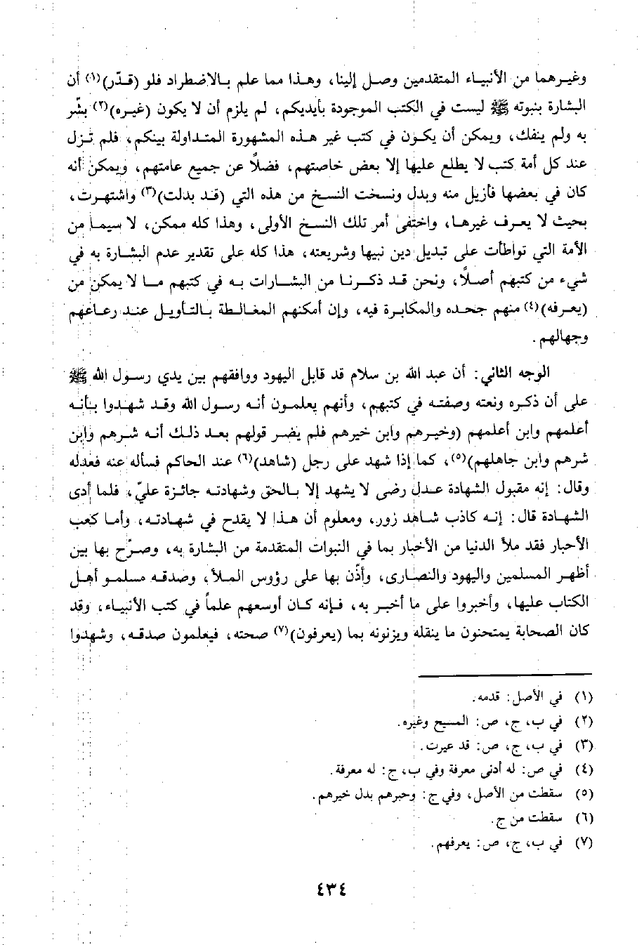 وَغَيْرُهُمَا مِنَ الْأَنْبِيَاءِ الْمُتَقَدِّمِينَ وَصَلَ إِلَيْنَا، وَهَذَا مِمَّا عُلِمَ بِالِاضْطِرَادِ. فَلَوْ قُدِّرَ أَنَّ الْبِشَارَةَ بِنُبُوَّتِهِ صَلَّى اللَّهُ عَلَيْهِ وَسَلَّمَ لَيْسَتْ فِي الْكُتُبِ الْمَوْجُودَةِ بِأَيْدِيكُمْ، لَمْ يَلْزَمْ أَنْ لَا يَكُونَ غَيْرُهُ بَشَّرَ بِهِ، وَلَمْ يَنْفَكَّ، وَيُمْكِنْ أَنْ يَكُونَ فِي كُتُبٍ غَيْرِ هَذِهِ الْمَشْهُورَةِ الْمُتَدَاوَلَةِ بَيْنَكُمْ، فَلَمْ تَزَلْ عِنْدَ كُلِّ أُمَّةٍ كُتُبٌ لَا يَطَّلِعُ عَلَيْهَا إِلَّا بَعْضُ خَاصَّتِهِمْ، فَضْلًا عَنْ جَمِيعِ عَامَّتِهِمْ، وَيُمَكِّنُ أَنَّهُ كَانَ فِي بَعْضِهَا فَأُزِيلَ مِنْهُ وَبُدِّلَ، وَنُسِخَتِ النُّسَخُ مِنْ هَذِهِ الَّتِي قَدْ بُدِّلَتْ وَاشْتَهَرَتْ، بِحَيْثُ لَا يُعْرَفُ غَيْرُهَا، وَاخْتَفَى أَمْرُ تِلْكَ النُّسَخِ الْأُولَى، وَهَذَا كُلُّهُ مُمْكِنٌ، لَا سِيَّمَا مِنَ الْأُمَّةِ الَّتِي تَوَاطَأَتْ عَلَى تَبْدِيلِ دِينِ نَبِيِّهَا وَشَرِيعَتِهِ، هَذَا كُلُّهُ عَلَى تَقْدِيرِ عَدَمِ الْبِشَارَةِ بِهِ فِي شَيْءٍ مِنْ كُتُبِهِمْ أَصْلًا. وَنَحْنُ قَدْ ذَكَرْنَا مِنَ الْبِشَارَاتِ بِهِ فِي كُتُبِهِمْ مَا لَا يُمْكِنُ مِنْهُمْ جَحْدُهُ وَالْمُكَابَرَةُ فِيهِ، وَإِنْ أَمْكَنَهُمُ الْمُغَالَطَةُ بِالتَّأْوِيلِ عِنْدَ رَعَاعِهِمْ وَجُهَّالِهِمْ.