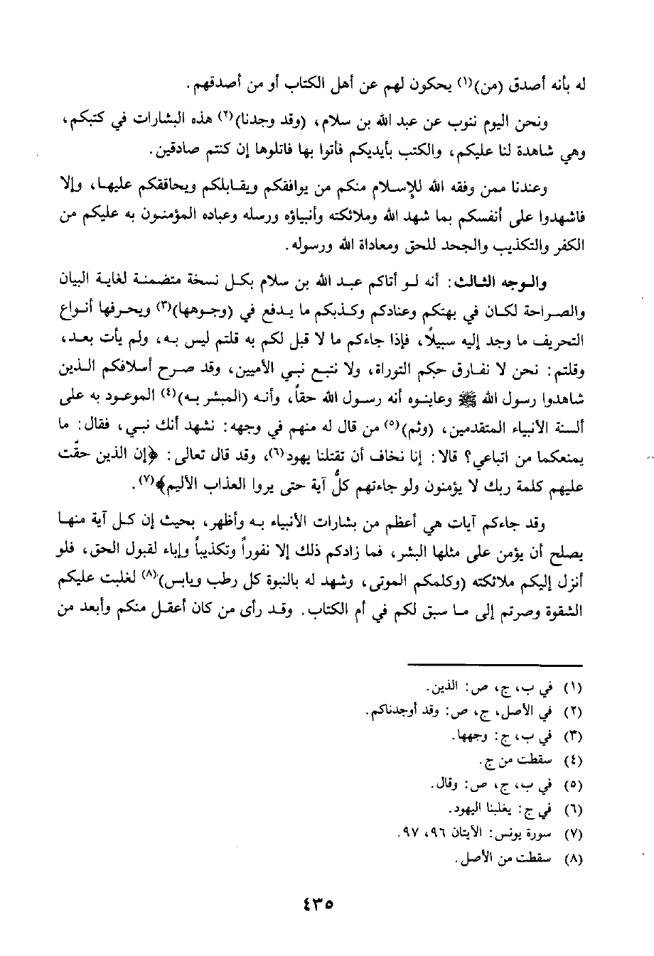 الْوَجْهُ الثَّالِثُ: أَنَّهُ لَوْ أَتَاكُمْ عَبْدُ اللَّهِ بْنُ سَلَامٍ بِكُلِّ نُسْخَةٍ مُتَضَمِّنَةٍ لِغَايَةِ الْبَيَانِ وَالصَّرَاحَةِ لَكَانَ فِي بَهَتَكُمْ وَعِنَادِكُمْ وَكَذِبِكُمْ مَا يَدْفَعُ فِي وُجُوهِهَا وَيُحَرِّفُهَا أَنْوَاعَ التَّحْرِيفِ مَا وَجَدَ إِلَيْهِ سَبِيلًا، فَإِذَا جَاءَكُمْ مَا لَا قِبَلَ لَكُمْ بِهِ قُلْتُمْ لَيْسَ بِهِ، وَلَمْ يَأْتِ بَعْدُ، وَقُلْتُمْ: نَحْنُ لَا نُفَارِقُ حُكْمَ التَّوْرَاةِ، وَلَا نَتَّبِعُ نَبِيَّ الْأُمِّيِّينَ، وَقَدْ صَرَّحَ أَسْلَافُكُمُ الَّذِينَ شَاهَدُوا رَسُولَ اللَّهِ صَلَّى اللَّهُ عَلَيْهِ وَسَلَّمَ وَعَايَنُوهُ أَنَّهُ رَسُولُ اللَّهِ حَقًّا، وَأَنَّهُ الْمُبَشَّرُ بِهِ الْمَوْعُودُ بِهِ عَلَى أَلْسِنَةِ الْأَنْبِيَاءِ الْمُتَقَدِّمِينَ، وَثُمَّ مَنْ قَالَ لَهُ مِنْهُمْ فِي وَجْهِهِ: نَشْهَدُ أَنَّكَ نَبِيٌّ، فَقَالَ: مَا يَمْنَعُكُمَا مِنَ اتِّبَاعِي؟، قَالَ: إِنَّا نَخَافُ أَنْ تَقْتُلَنَا يَهُودُ، وَقَدْ قَالَ تَعَالَى: إِنَّ الَّذِينَ حَقَّتْ عَلَيْهِمْ كَلِمَةُ رَبِّكَ لَا يُؤْمِنُونَ وَلَوْ جَاءَتْهُمْ كُلُّ آيَةٍ حَتَّى يَرَوُا الْعَذَابَ الْأَلِيمَ.