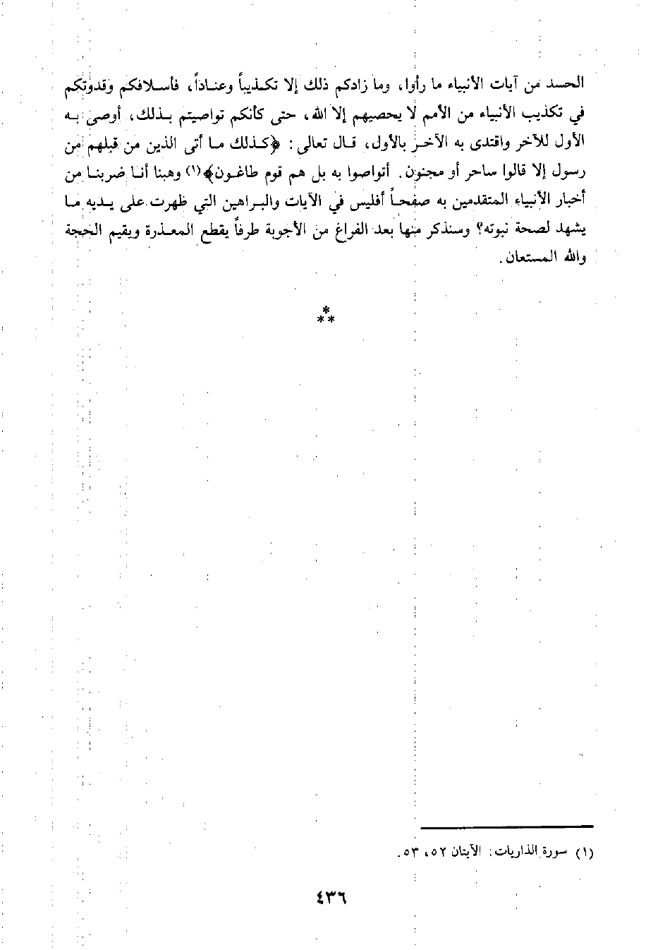 الْحَسَدِ مِنْ آيَاتِ الْأَنْبِيَاءِ مَا رَأَوْا، وَمَا زَادَكُمْ ذَلِكَ إِلَّا تَكْذِيبًا وَعِنَادًا، فَأَسْلَافُكُمْ وَقُدْوَتُكُمْ فِي تَكْذِيبِ الْأَنْبِيَاءِ مِنَ الْأُمَمِ لَا يُحْصِيهِمْ إِلَّا اللَّهُ، حَتَّى كَأَنَّكُمْ تَوَاصَيْتُمْ بِذَلِكَ، أَوْصَى بِهِ الْأَوَّلُ لِلْآخِرِ وَاقْتَدَى فِيهِ الْآخِرُ بِالْأَوَّلِ، قَالَ تَعَالَى: كَذَلِكَ مَا أَتَى الَّذِينَ مِنْ قَبْلِهِمْ مِنْ رَسُولٍ إِلَّا قَالُوا سَاحِرٌ أَوْ مَجْنُونٌ أَتَوَاصَوْا بِهِ بَلْ هُمْ قَوْمٌ طَاغُونَ، وَهَبْنَا أَنَّا ضَرَبْنَا مِنْ أَخْبَارِ الْأَنْبِيَاءِ الْمُتَقَدِّمِينَ بِهِ صَفْحًا، أَفَلَيَسَ فِي الْآيَاتِ وَالْبَرَاهِينِ الَّتِي ظَهَرَتْ عَلَى يَدَيْهِ مَا يَشْهَدُ لِصِحَّةِ نُبُوَّتِهِ؟! وَسَنَذْكُرُ مِنْهَا بَعْدَ الْفَرَاغِ مِنَ الْأَجْوِبَةِ طَرَفًا يَقْطَعُ الْمَعْذِرَةَ، وَيُقِيمُ الْحُجَّةَ، وَاللَّهُ الْمُسْتَعَانُ.