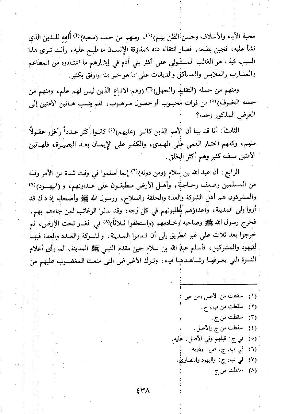 الرَّابِعُ: أَنَّ عَبْدَ اللَّهِ بْنَ سَلَامٍ وَمَنْ دُونِهِ إِنَّمَا أَسْلَمُوا فِي وَقْتِ شِدَّةٍ مِنَ الْأَمْرِ وَقِلَّةٍ مِنَ الْمُسْلِمِينَ وَضَعْفٍ وَحَاجَةٍ، وَأَهْلُ الْأَرْضِ مُطْبِقُونَ عَلَى عَدَاوَتِهِمْ، وَالْيَهُودُ وَالْمُشْرِكُونَ هُمْ أَهْلُ الشَّوْكَةِ وَالْعُدَّةِ وَالْحَلَقَةِ وَالسِّلَاحِ، وَرَسُولُ اللَّهِ صَلَّى اللَّهُ عَلَيْهِ وَسَلَّمَ وَأَصْحَابُهُ إِذْ ذَاكَ قَدْ أَوَوْا إِلَى الْمَدِينَةِ، وَأَعْدَاؤُهُمْ يَطْلُبُونَهُمْ فِي كُلِّ وَجْهٍ، وَقَدْ بَذَلُوا الرَّغَائِبَ لِمَنْ جَاءَهُمْ بِهِمْ، فَخَرَجَ رَسُولُ اللَّهِ صَلَّى اللَّهُ عَلَيْهِ وَسَلَّمَ وَصَاحِبُهُ وَخَادِمُهُمْ وَاسْتَخْفُوا ثَلَاثًا فِي غَارٍ تَحْتَ الْأَرْضِ، ثُمَّ خَرَجُوا بَعْدَ ثَلَاثٍ عَلَى غَيْرِ الطَّرِيقِ إِلَى أَنْ قَدِمُوا الْمَدِينَةَ، وَالشَّوْكَةُ وَالْعَدَدُ وَالْعُدَّةُ فِيهَا لِلْيَهُودِ وَالْمُشْرِكِينَ، فَأَسْلَمَ عَبْدُ اللَّهِ بْنُ سَلَامٍ حِينَ مَقْدَمِ النَّبِيِّ صَلَّى اللَّهُ عَلَيْهِ وَسَلَّمَ الْمَدِينَةَ، لَمَّا رَأَى أَعْلَامَ النُّبُوَّةَ الَّتِي كَانَ يَعْرِفُهَا وَشَاهَدَهَا فِيهِ، وَتَرَكَ الْأَغْرَاضَ الَّتِي مَنَعَتِ الْمَغْضُوبَ عَلَيْهِمْ مِنَ
