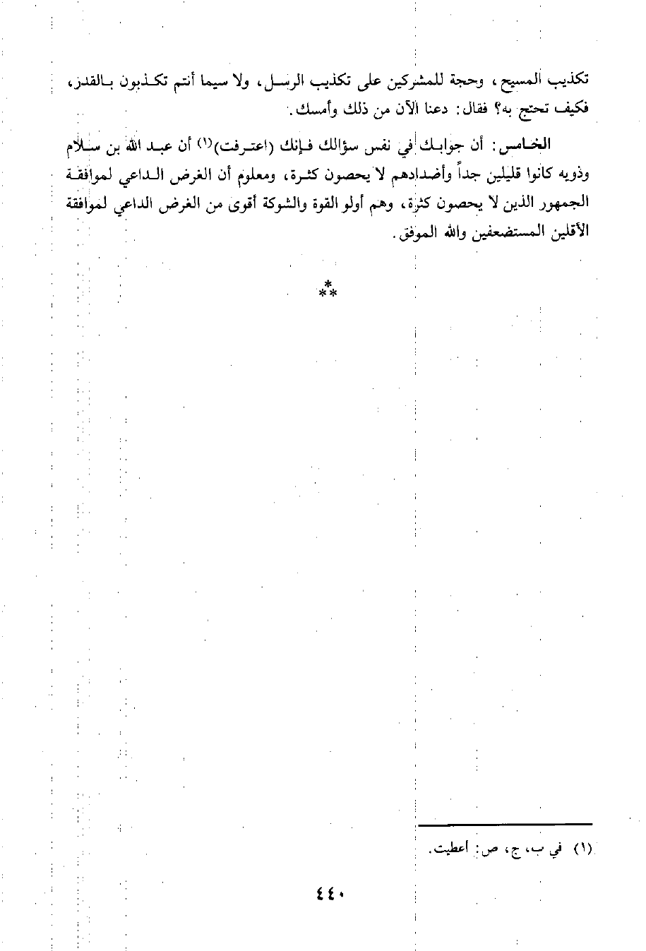 الْخَامِسُ: أَنَّ جَوَابَكَ فِي نَفْسِ سُؤَالِكَ فَإِنَّكَ اعْتَرَفْتَ أَنَّ عَبْدَ اللَّهِ بْنَ سَلَامٍ وَذَوِيهِ كَانُوا قَلِيلِينَ جِدًّا وَأَضْدَادُهُمْ لَا يُحْصَوْنَ كَثْرَةً، وَمَعْلُومٌ أَنَّ الْغَرَضَ الدَّاعِيَ لِمُوَافَقَةِ الْجُمْهُورِ الَّذِينَ لَا يُحْصَوْنَ كَثْرَةً، وَهُمْ أُولُو الْقُوَّةِ وَالشَّوْكَةِ أَقْوَى مِنَ الْغَرَضِ الدَّاعِي لِمُوَافَقَةِ الْأَقَلِّينَ الْمُسْتَضْعَفِينَ. وَاللَّهُ الْمُوَفِّقُ.