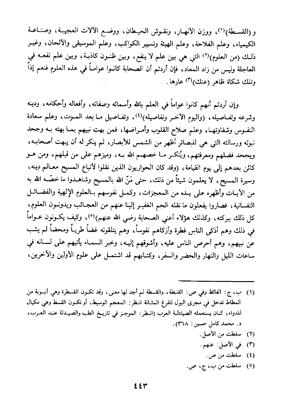 وَالْقَسْطَةِ، وَوَزْنِ الْأَنْهَارِ وَنُقُوشِ الْحِيطَانِ، وَوَضْعِ الْآلَاتِ الْعَجِيبَةِ، وَصِنَاعَةِ الْكِيمْيَاءِ، وَعِلْمِ الْفِلَاحَةِ، وَعِلْمِ الْهَيْئَةِ وَتَسْيِيرِ الْكَوَاكِبِ، وَعِلْمِ الْمُوسِيقَى وَالْأَلْحَانِ، وَغَيْرِ ذَلِكَ مِنَ الْعُلُومِ الَّتِي هِيَ بَيْنَ عِلْمٍ لَا يَنْفَعُ، وَبَيْنَ ظُنُونٍ كَاذِبَةٍ، وَبَيْنَ عِلْمٍ نَفْعُهُ فِي الْعَاجِلَةِ وَلَيْسَ مِنْ زَادِ الْمَعَادِ، فَإِنْ أَرَدْتُمْ أَنَّ الصَّحَابَةَ كَانُوا عَوَامًّا فِي هَذِهِ الْعُلُومِ فَنَعَمْ إِذًا، وَتِلْكَ شَكَاةٌ ظَاهِرٌ عَنْكَ عَارُهَا.