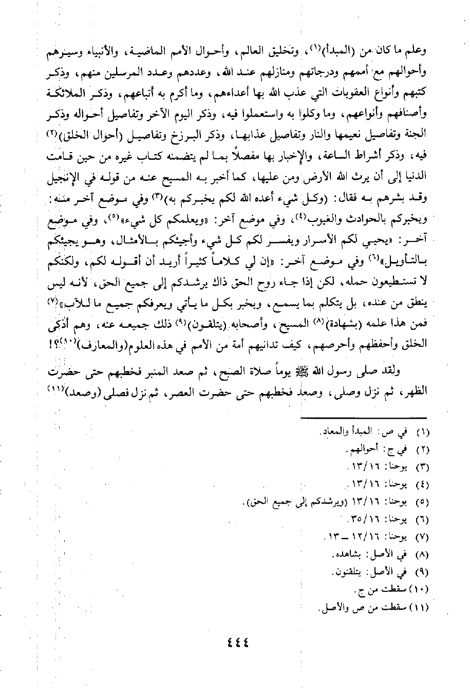 وَعِلْمِ مَا كَانَ مِنَ الْمَبْدَأِ، وَتَخْلِيقِ الْعَالِمِ، وَأَحْوَالِ الْأُمَمِ الْمَاضِيَةِ، وَالْأَنْبِيَاءِ وَسِيَرِهِمْ وَأَحْوَالِهِمْ مَعَ أُمَمِهِمْ، وَدَرَجَاتِهِمْ وَمَنَازِلِهِمْ عِنْدَ اللَّهِ، وَعَدَدِهِمْ، وَعَدَدِ الْمُرْسَلِينَ مِنْهُمْ، وَذِكْرِ كُتُبِهِمْ وَأَنْوَاعِ الْعُقُوبَاتِ الَّتِي عَذَّبَ اللَّهُ بِهَا أَعْدَاءَهُمْ، وَمَا أَكْرَمَ بِهِ أَتْبَاعَهُمْ، وَذِكْرِ الْمَلَائِكَةِ وَأَصْنَافِهِمْ وَأَنْوَاعِهِمْ وَمَا وُكِّلُوا بِهِ وَاسْتُعْمِلُوا فِيهِ، وَذِكْرِ الْيَوْمِ الْآخِرِ وَتَفَاصِيلِ أَحْوَالِهِ، وَذِكْرِ الْجَنَّةِ وَتَفَاصِيلِ نَعِيمِهَا، وَالنَّارِ وَتَفَاصِيلِ عَذَابِهَا، وَذِكْرِ الْبَرْزَخِ وَتَفَاصِيلِ أَحْوَالِ الْخَلْقِ فِيهِ، وَذِكْرِ أَشْرَاطِ السَّاعَةِ وَالْإِخْبَارِ بِهَا مُفَصَّلًا بِمَا لَمْ يَتَضَمَّنْهُ كِتَابٌ غَيْرُهُ مِنْ حِينِ قَامَتِ الدُّنْيَا إِلَى أَنْ يَرِثَ اللَّهُ الْأَرْضَ وَمَنْ عَلَيْهَا، كَمَا أَخْبَرَ بِهِ الْمَسِيحُ عَنْهُ مِنْ قَوْلِهِ فِي الْإِنْجِيلِ وَقَدْ بَشَّرَهُمْ بِهِ فَقَالَ: وَكُلُّ شَيْءٍ أَعَدَّهُ اللَّهُ لَكُمْ يُخْبِرُكُمْ بِهِ، وَفِي مَوْضِعٍ آخَرَ مِنْهُ: وَيُخْبِرُكُمْ بِالْحَوَادِثِ وَالْغُيُوبِ، وَفِي مَوْضِعٍ آخَرَ وَيُعَلِّمُكُمْ كُلَّ شَيْءٍ، وَفِي مَوْضِعٍ آخَرَ: يُحْيِي لَكُمُ الْأَسْرَارَ وَيُفَسِّرُ لَكُمْ كُلَّ شَيْءٍ وَأَجِيئُكُمْ بِالْأَمْثَالِ وَهُوَ يَجِيئُكُمْ بِالتَّأْوِيلِ، وَفِي مَوْضِعٍ آخَرَ: إِنَّ لِي كَلَامًا كَثِيرًا أُرِيدُ أَنْ أَقُولَهُ لَكُمْ، وَلَكِنَّكُمْ لَا تَسْتَطِيعُونَ حَمْلَهُ، لَكِنْ إِذَا جَاءَ رُوحُ الْحَقِّ ذَاكَ يُرْشِدُكُمْ إِلَى جَمِيعِ الْحَقِّ، لِأَنَّهُ لَيْسَ يَنْطِقُ مِنْ عِنْدِهِ بَلْ يَتَكَلَّمُ بِمَا يَسْمَعُ، وَيُخْبِرُكُمْ بِكُلِّ مَا يَأْتِي، وَيُعَرِّفُكُمْ جَمِيعَ مَا لِلْأَبِّ. فَمَنْ هَذَا عِلْمُهُ بِشَهَادَةِ الْمَسِيحِ، وَأَصْحَابُهُ يَتَلَقَّوْنَ ذَلِكَ جَمِيعَهُ عَنْهُ، وَهُمْ أَذْكَى الْخَلْقِ وَأَحْفَظُهُمْ وَأَحْرَصُهُمْ، كَيْفَ تُدَانِيهِمْ أُمَّةٌ مِنَ الْأُمَمِ فِي هَذِهِ الْعُلُومِ وَالْمَعَارِفِ؟