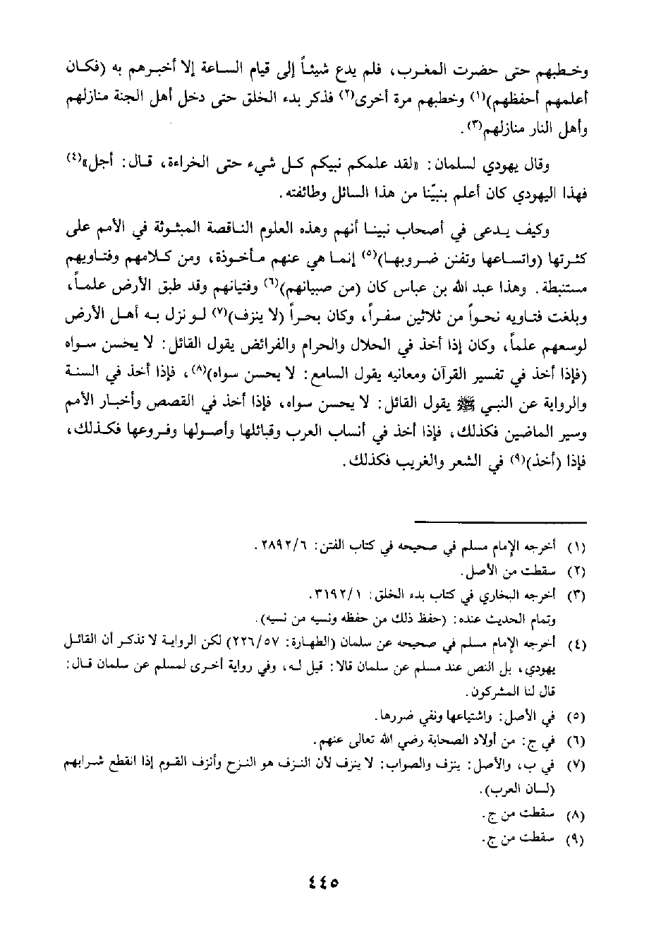 وَكَيْفَ يُدَّعَى فِي أَصْحَابِ نَبِيِّنَا أَنَّهُمْ وَهَذِهِ الْعُلُومُ النَّاقِصَةُ الْمَبْثُوثَةُ فِي الْأُمَمِ عَلَى كَثْرَتِهَا وَاتِّسَاعِهَا وَتَفَنُّنِ ضُرُوبِهَا إِنَّمَا هِيَ عَنْهُمْ مَأْخُوذَةٌ، وَمِنْ كَلَامِهِمْ وَفَتَاوِيهِمْ مُسْتَنْبَطَةٌ، وَهَذَا عَبْدُ اللَّهِ بْنُ عَبَّاسٍ كَانَ مِنْ صِبْيَانِهِمْ وَفِتْيَانِهِمْ وَقَدْ طَبَقَ الْأَرْضَ عِلْمًا، وَبَلَغَتْ فَتَاوِيهِ نَحْوًا مِنْ ثَلَاثِينَ سِفْرًا، وَكَانَ بَحْرًا لَا يَنْزِفُ، لَوْ نَزَلَ بِهِ أَهْلُ الْأَرْضِ لَأَوْسَعَهُمْ عِلْمًا، وَكَانَ إِذَا أَخَذَ فِي الْحَلَالِ وَالْحَرَامِ وَالْفَرَائِضِ يَقُولُ الْقَائِلُ: لَا يُحْسِنُ سِوَاهُ، فَإِذَا أَخَذَ فِي تَفْسِيرِ الْقُرْآنِ وَمَعَانِيهِ يَقُولُ السَّامِعُ: لَا يُحْسِنُ سِوَاهُ، فَإِذَا أَخَذَ فِي السُّنَّةِ وَالرِّوَايَةِ عَنِ النَّبِيِّ صَلَّى اللَّهُ عَلَيْهِ وَسَلَّمَ يَقُولُ الْقَائِلُ: لَا يُحْسِنُ سِوَاهُ، فَإِذَا أَخَذَ فِي الْقَصَصِ وَأَخْبَارِ الْأُمَمِ وَسِيَرِ الْمَاضِينَ فَكَذَلِكَ، فَإِذَا أَخَذَ فِي أَنْسَابِ الْعَرَبِ وَقَبَائِلِهَا وَأُصُولِهَا وَفُرُوعِهَا فَكَذَلِكَ، فَإِذَا أَخَذَ فِي الشِّعْرِ وَالْغَرِيبِ فَكَذَلِكَ.