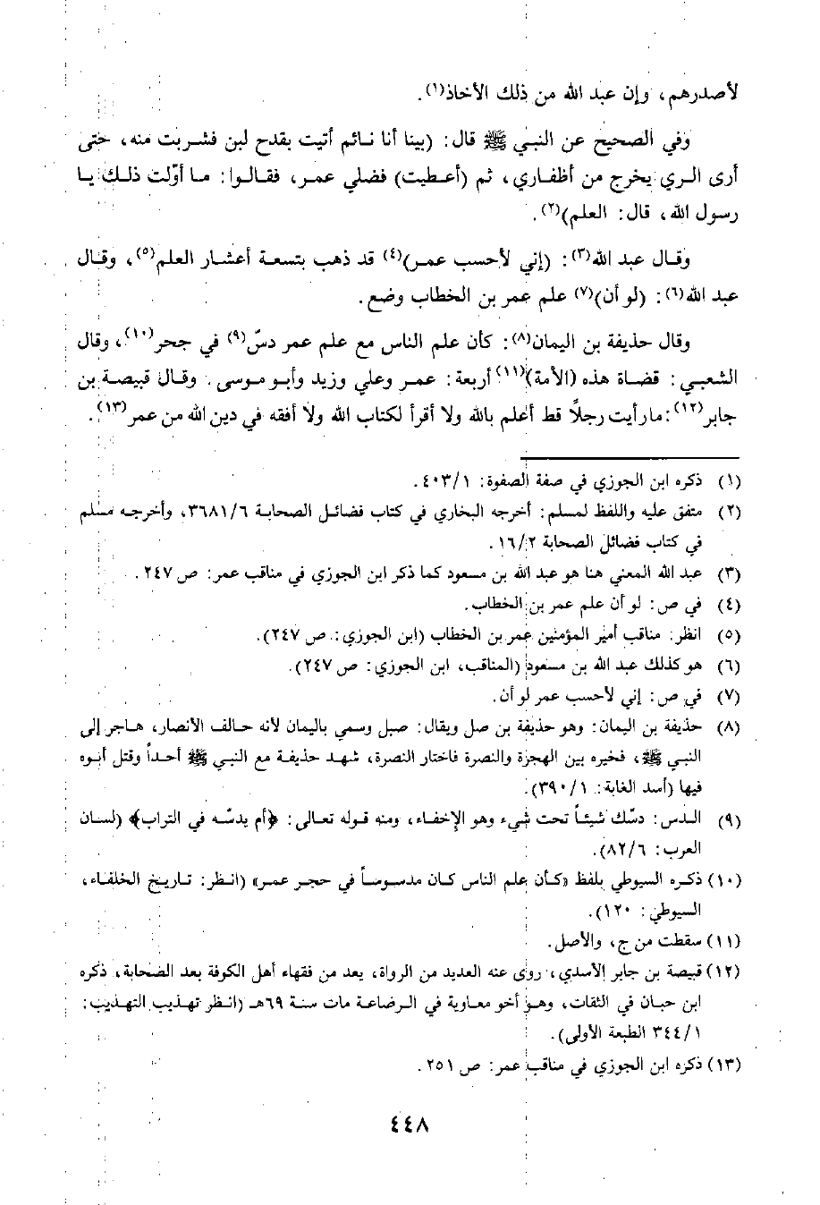وَقَالَ عَبْدُ اللَّهِ: إِنِّي لَأَحْسَبُ أَنَّ عُمَرَ قَدْ ذَهَبَ بِتِسْعَةِ أَعْشَارِ الْعِلْمِ....... وَقَالَ عَبْدُ اللَّهِ: لَوْ أَنَّ عِلْمَ عُمَرَ بْنِ الْخَطَّابِ وُضِعَ....